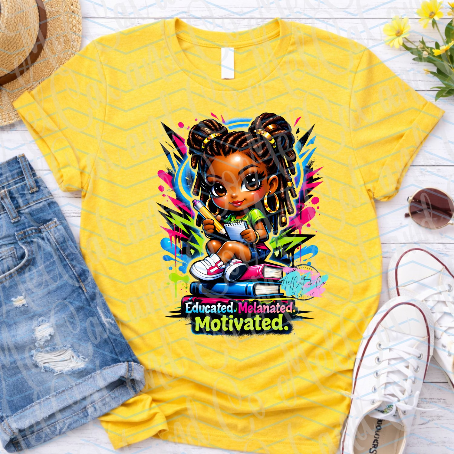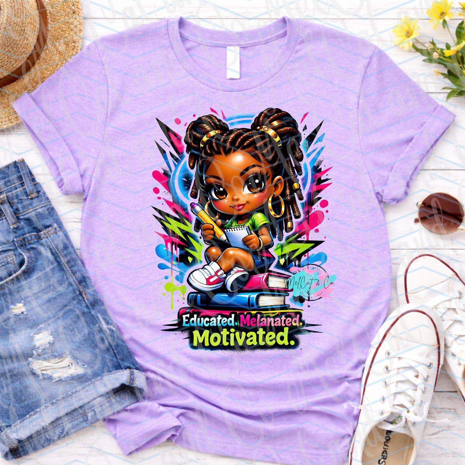 Celebrate confidence, culture, and education with this bold “Educated. Melanated. Motivated.” digital artwork. This high-impact design features a melanin chibi girl with locs, seated on a stack of books while holding a pencil and notebook, illustrated in a vibrant airbrush and modern graffiti style.