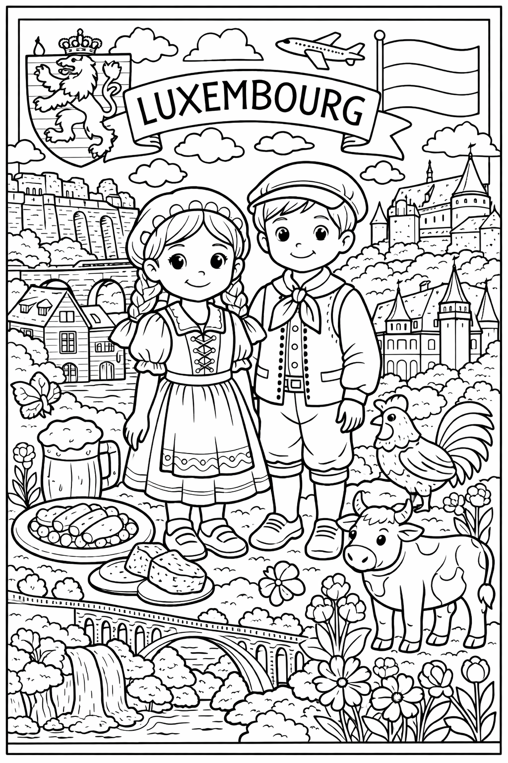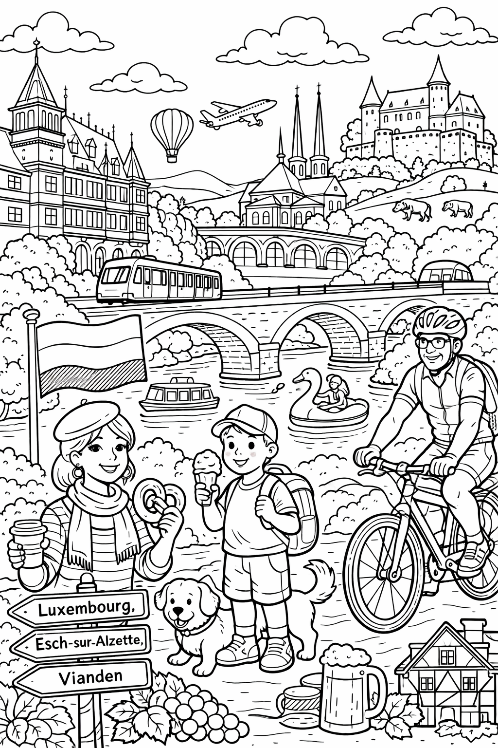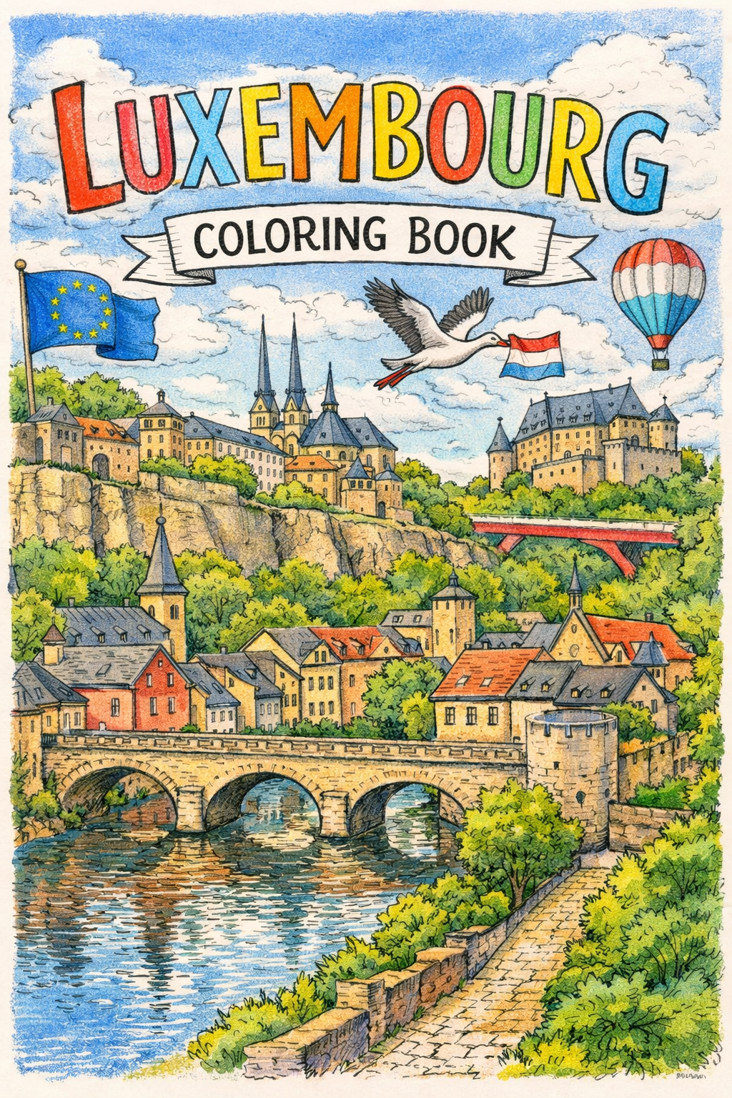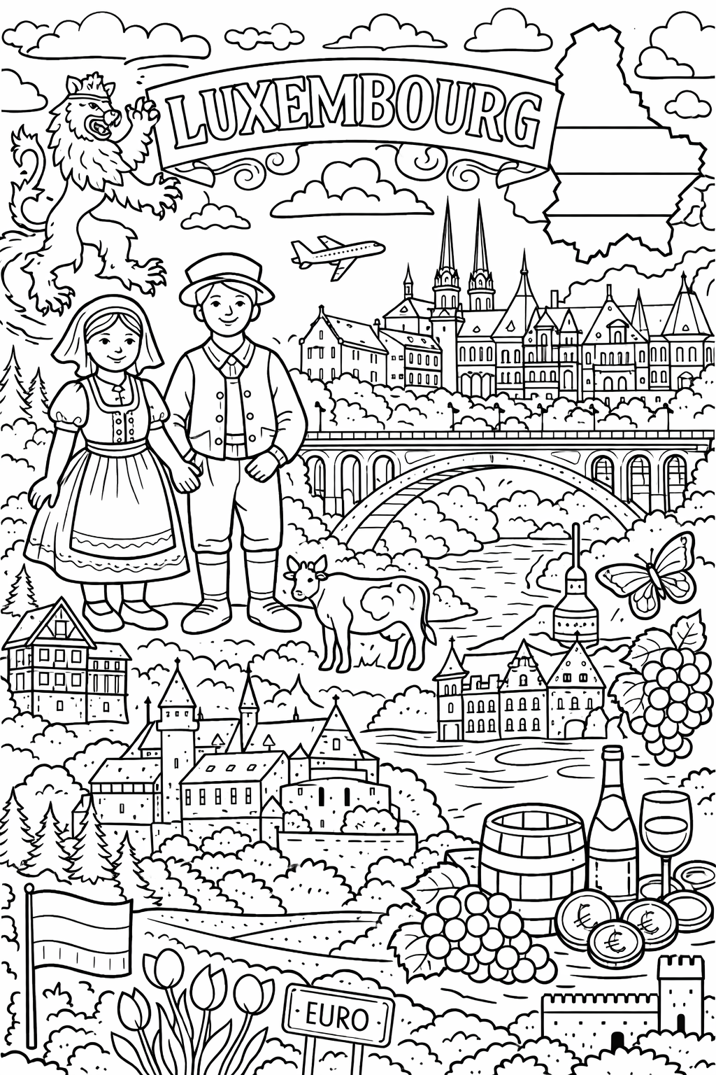 Luxembourg, coloring ebook, 69 pages, digital product, instantly download