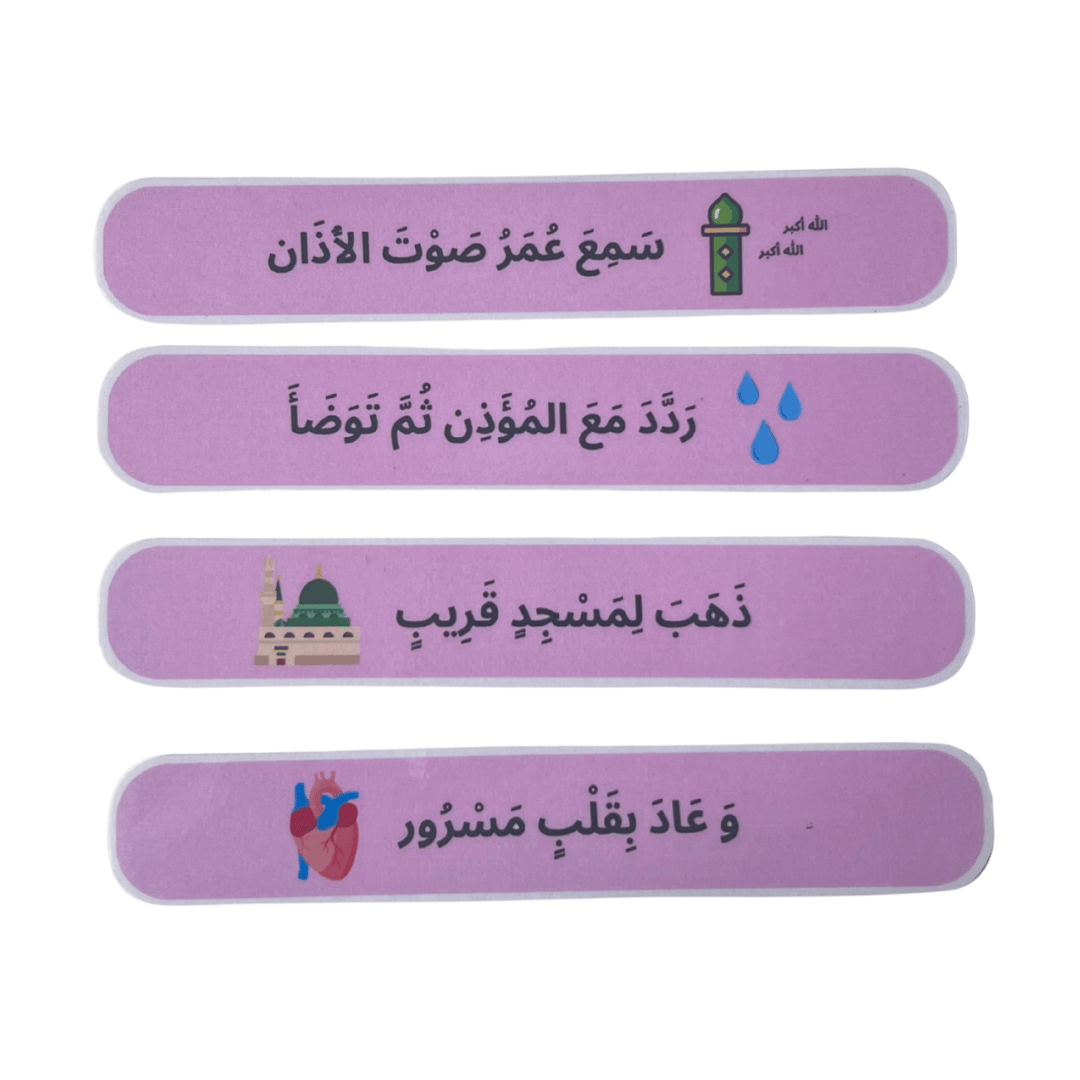 يختار الطفل قصة واحدة، يقرأ الجمل، ثم يقوم بترتيبها حسب تسلسل الأحداث الصحيح.