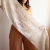 The stitch pattern is a 4-row zigzag pattern that is repeated throughout. Lace stripes are formed by dropped stitches.