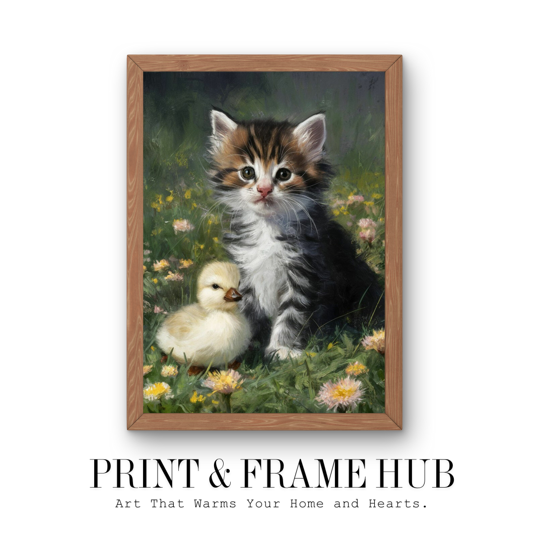 An adorable painting of a kitten and a duckling surrounded by flowers. The charming scene and rich colors bring a sense of innocence and delight, making this artwork a perfect addition to your home walls.