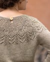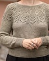 This pullover features a delicate circular lace pattern yoke. Short row shaping is used to shape the neckline while working lace and the back neck has a lovely button detail. There is no waist shaping in the pattern, however some waist shaping can be easily added. Sleeves are shaped with decreases. The length of the sweater can be modified since the pullover is worked from the top down.