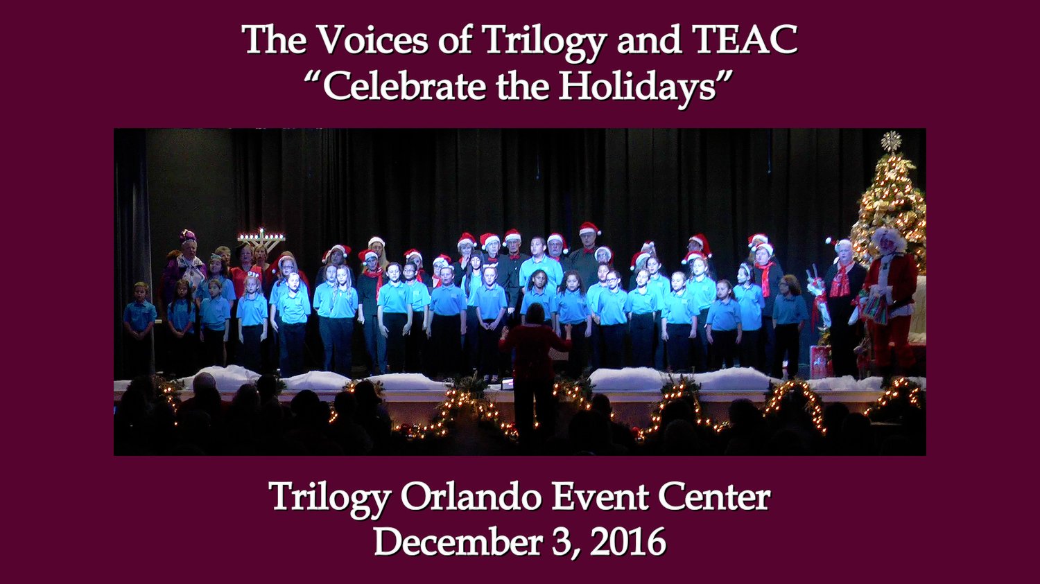 The Voices of Trilogy was joined by other performers including a children's choir to present an entertaining Holidays concert in the Trilogy Orlando Event Center on December 3, 2016. Also included is the Playbill for the show.
