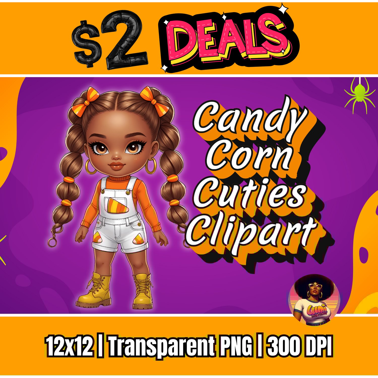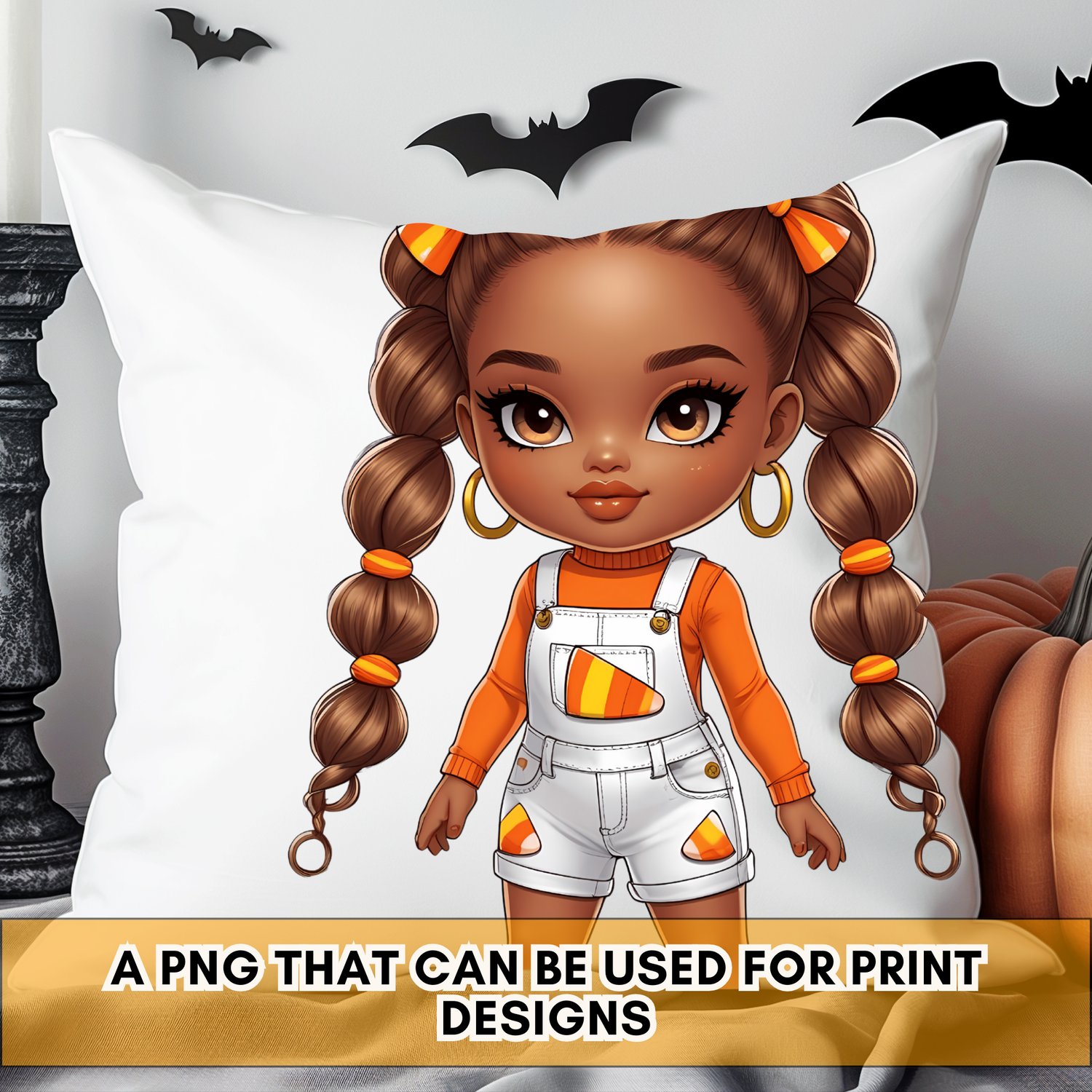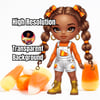Introducing one of the stars from the Candy Corn Cuties collection! This high-quality clipart features a beautifully illustrated fashion doll, bringing a trendy and modern vibe to the classic Halloween theme.