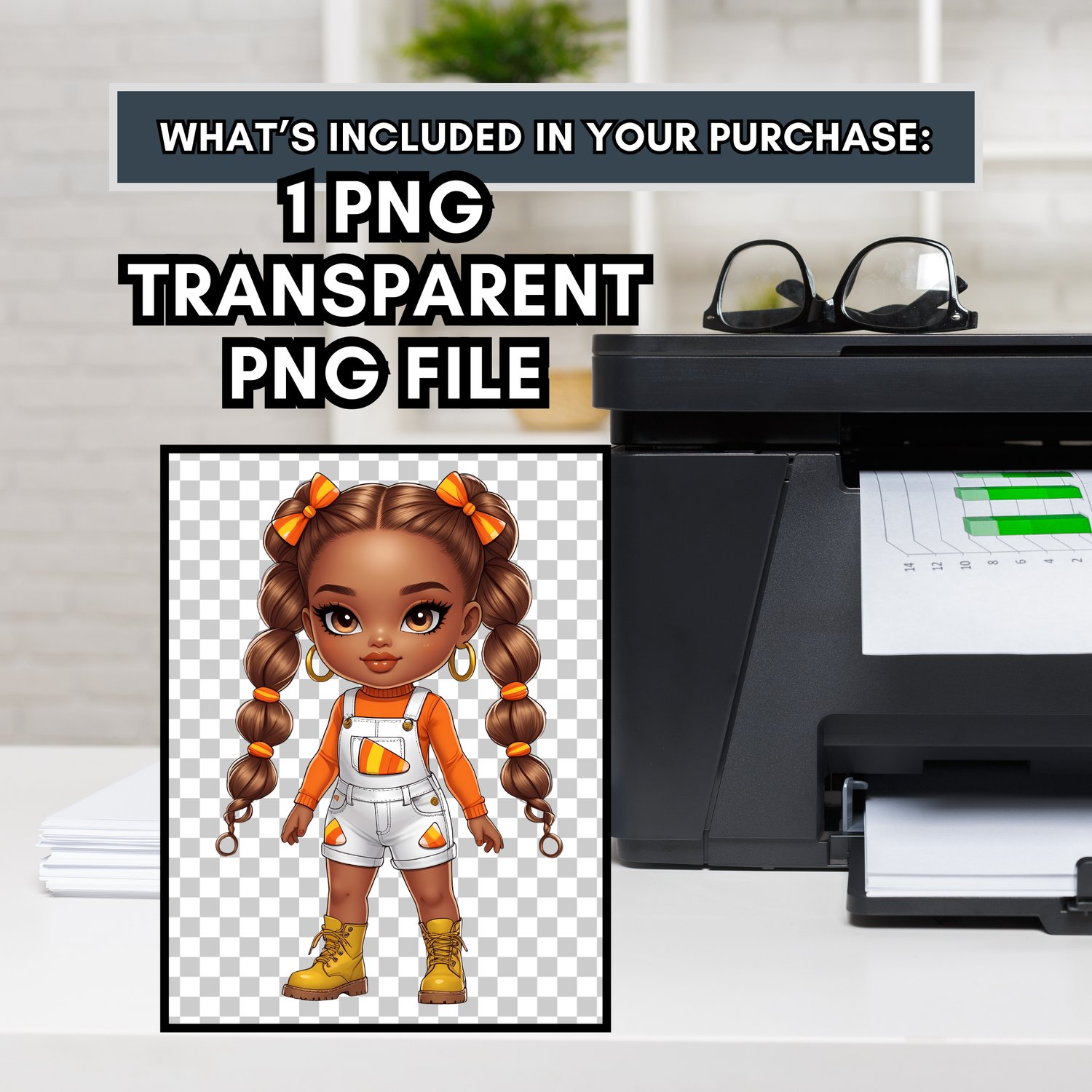 This specific Cutie is rocking 2 cute ponytails and a super cool orange shirt and white jumper shorts. Her confident pose and stylish details make her the perfect centerpiece for your design.