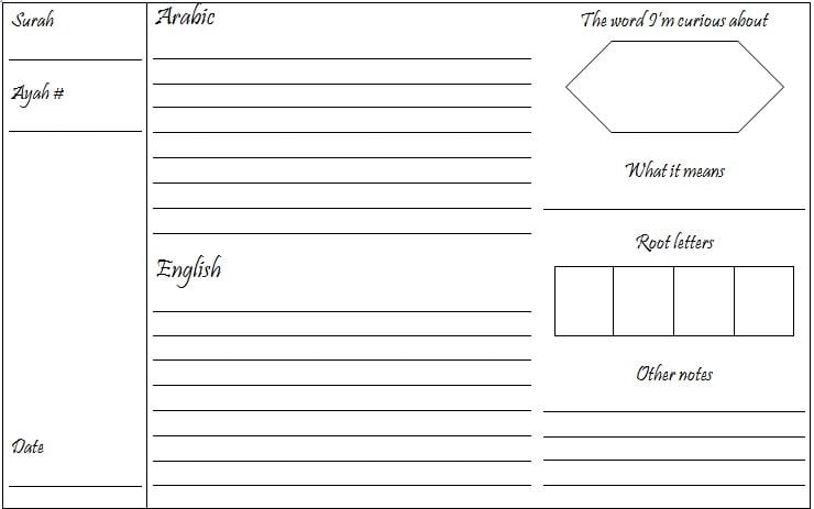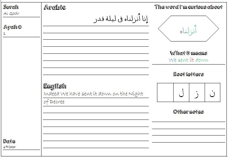 Since Arabic is a built on root letters there is space to add these. Likewise, we’ve included a section for further notes, be they grammar or tafsir related.