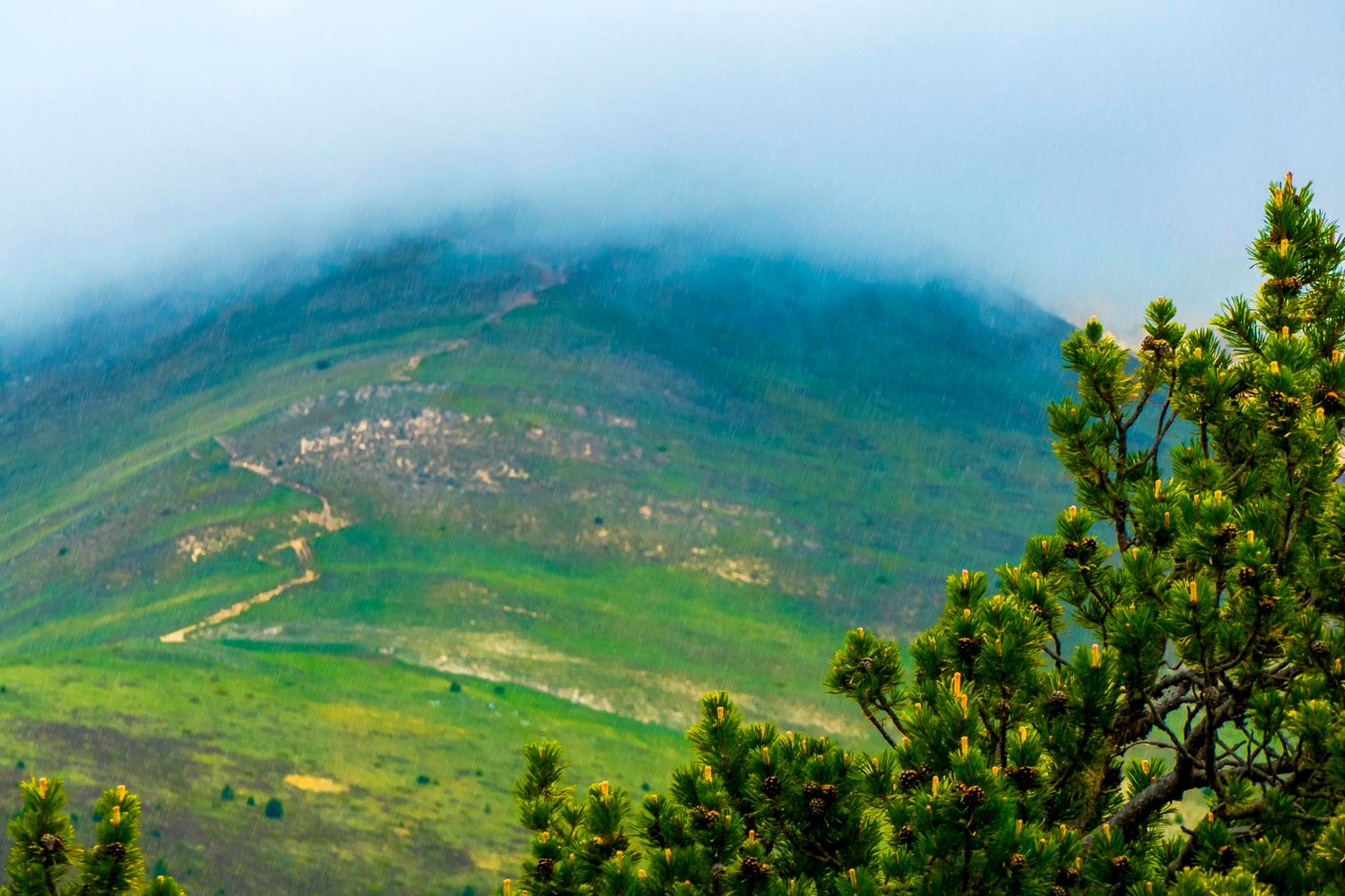 The rain sprinkles the green hills, partially covered by a layer of fog and creates a serene and peaceful atmosphere. A lone tree on the right adds depth and contrast to the predominantly green landscape.