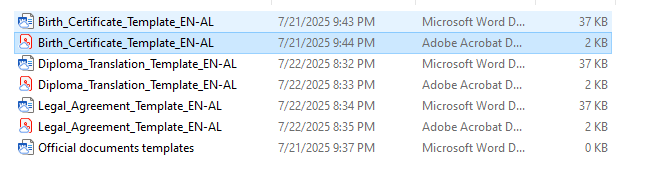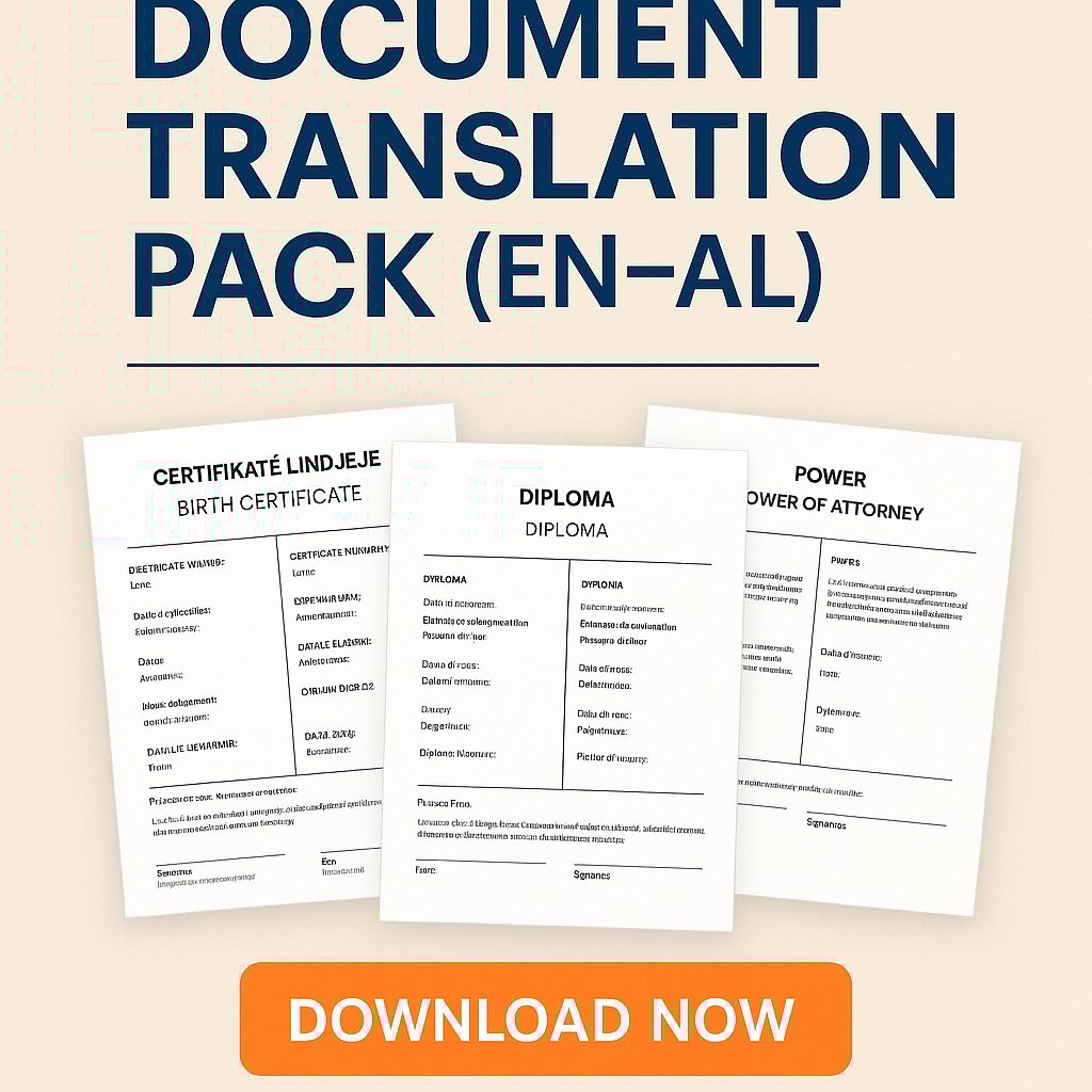 Official Document Translation Pack (EN–AL) – Birth, Diploma, Legal Templates