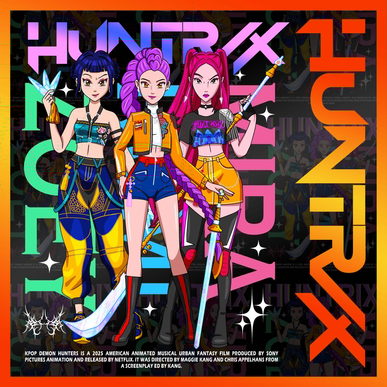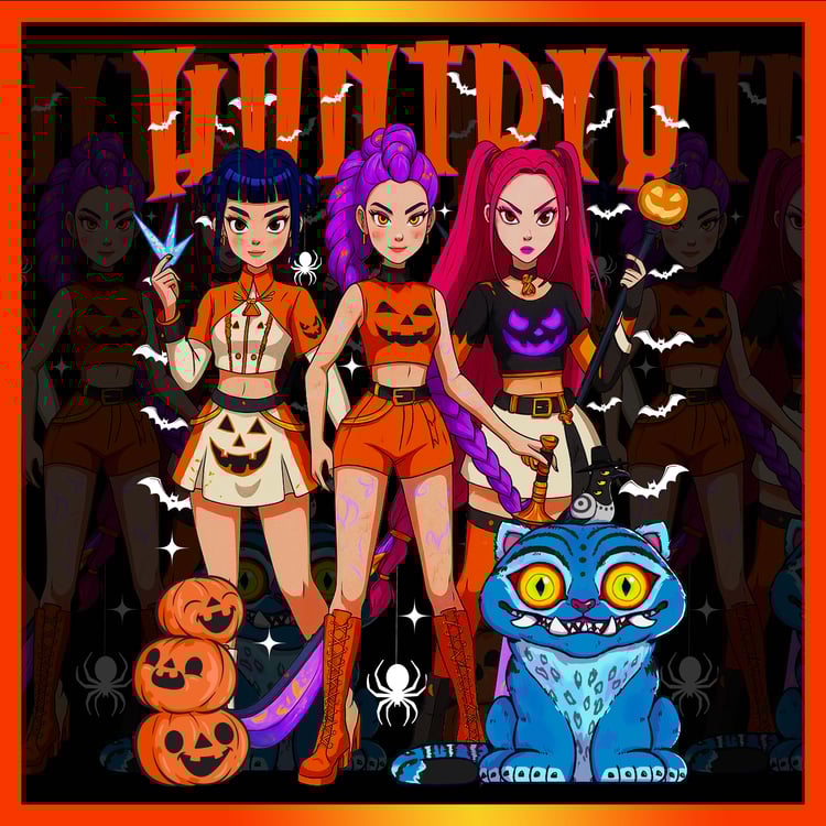 Step into the futuristic world of Huntrix: KPOP Demon Hunters, where fashion, anime, and urban fantasy collide! This exclusive artwork is inspired by vibrant K-pop aesthetics and bold anime vibes, making it perfect for fans, creators, and merchandising designers who want something unique and eye-catching.