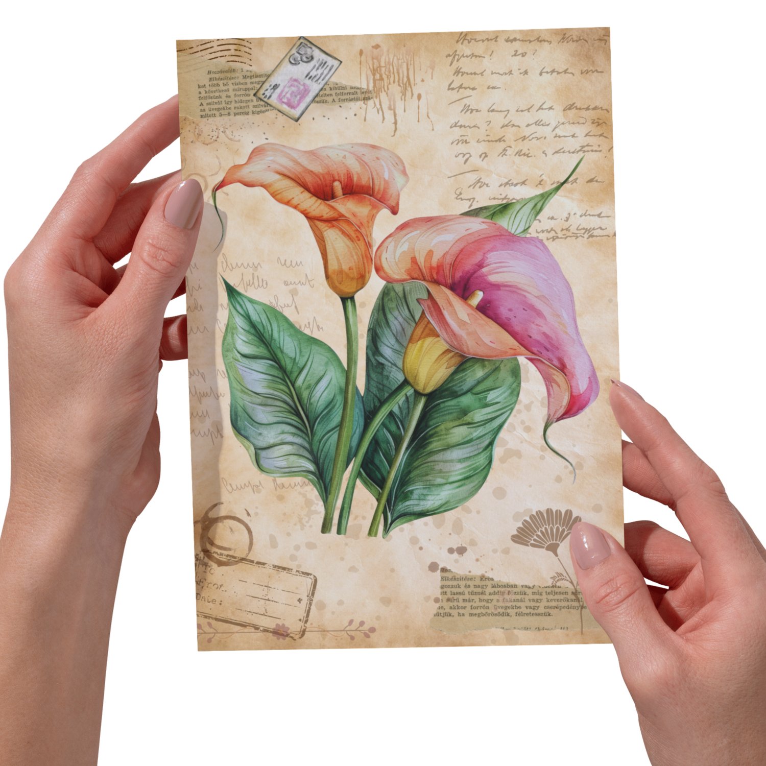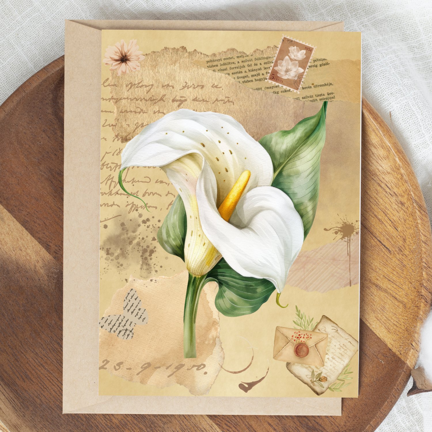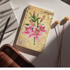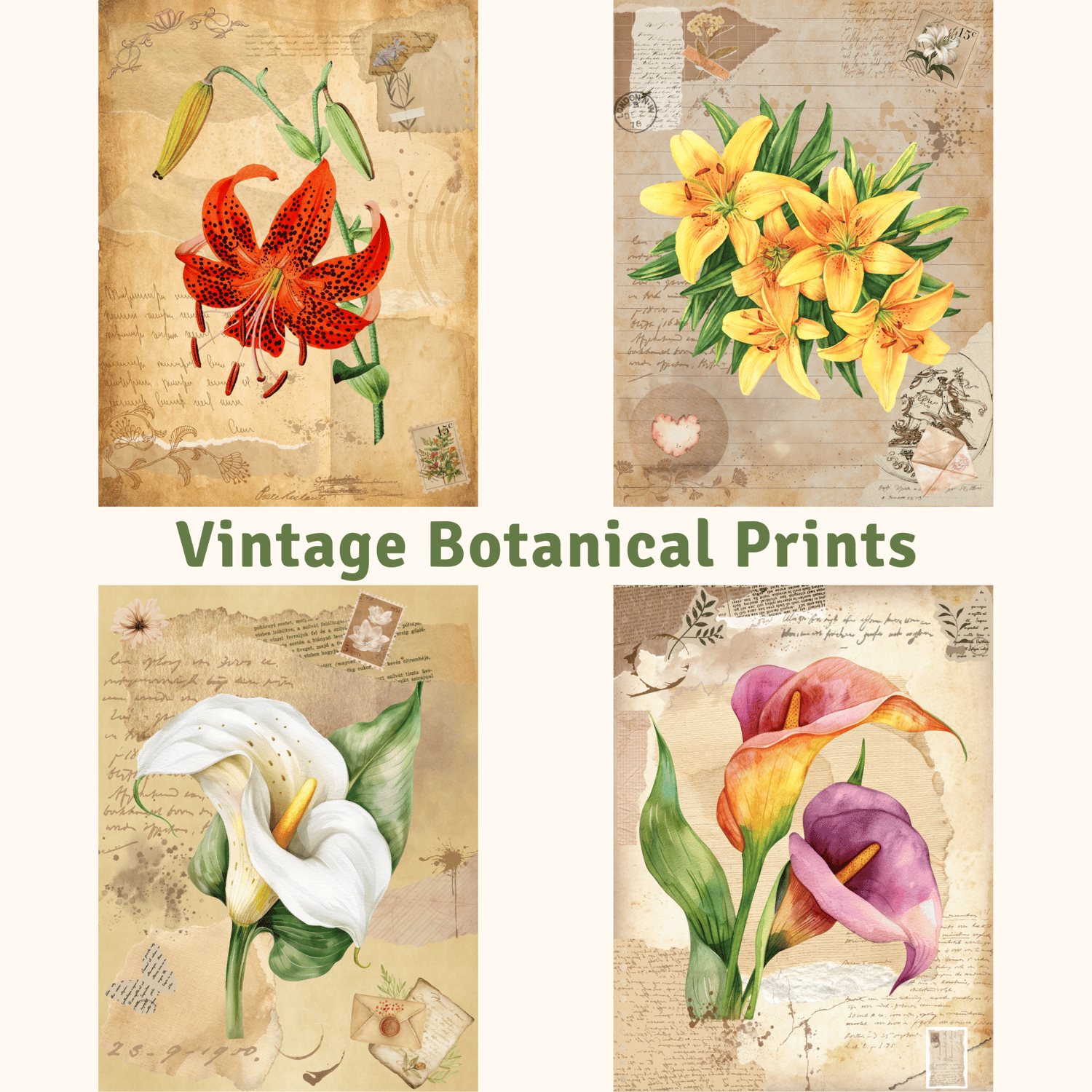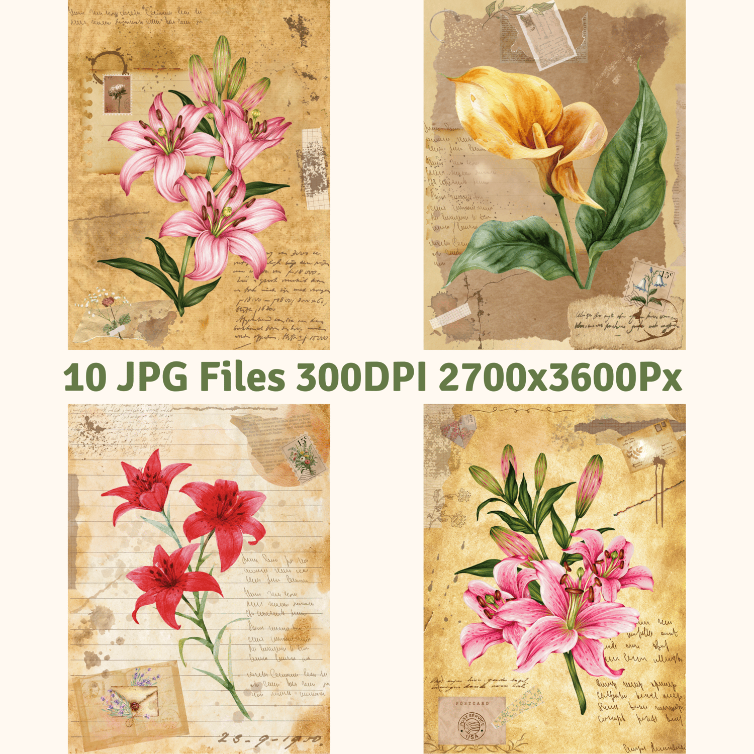 Add a romantic, old-world touch to your designs with this curated pack of vintage lily illustrations. Each image showcases a single lily on a richly textured antique background, adorned with layered botanical ephemera, vintage stamps, aged parchment, and torn paper details.