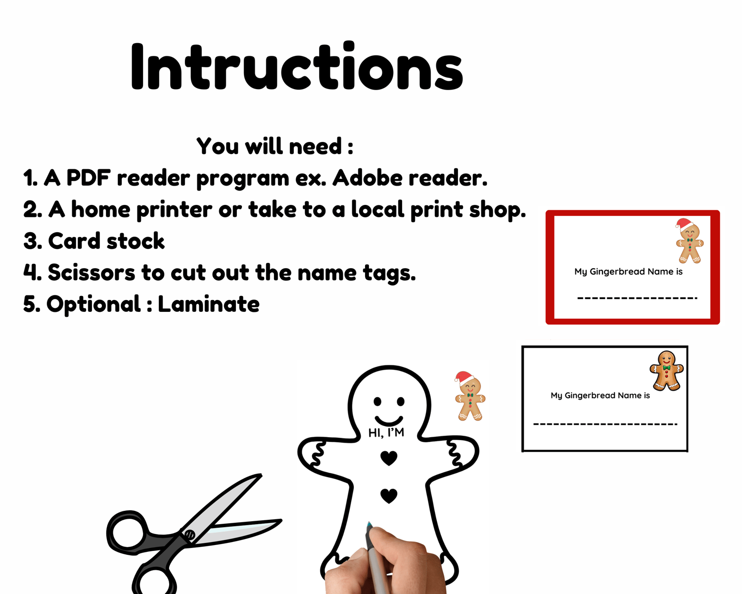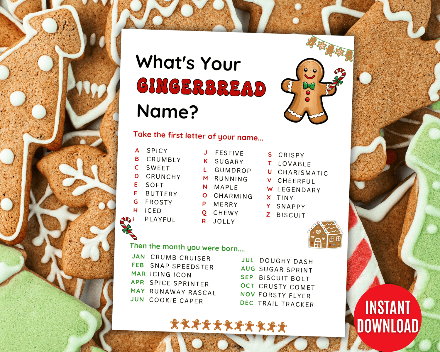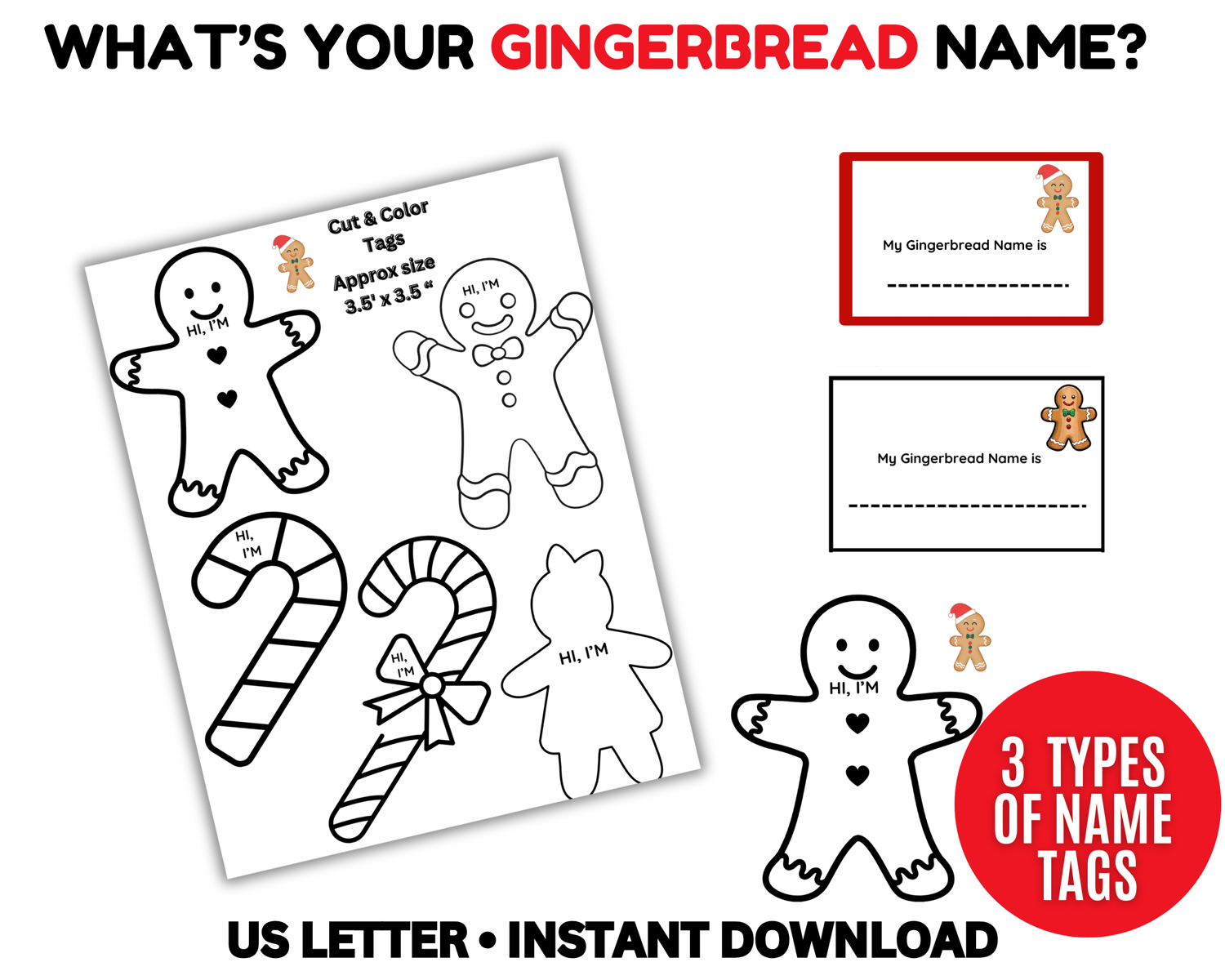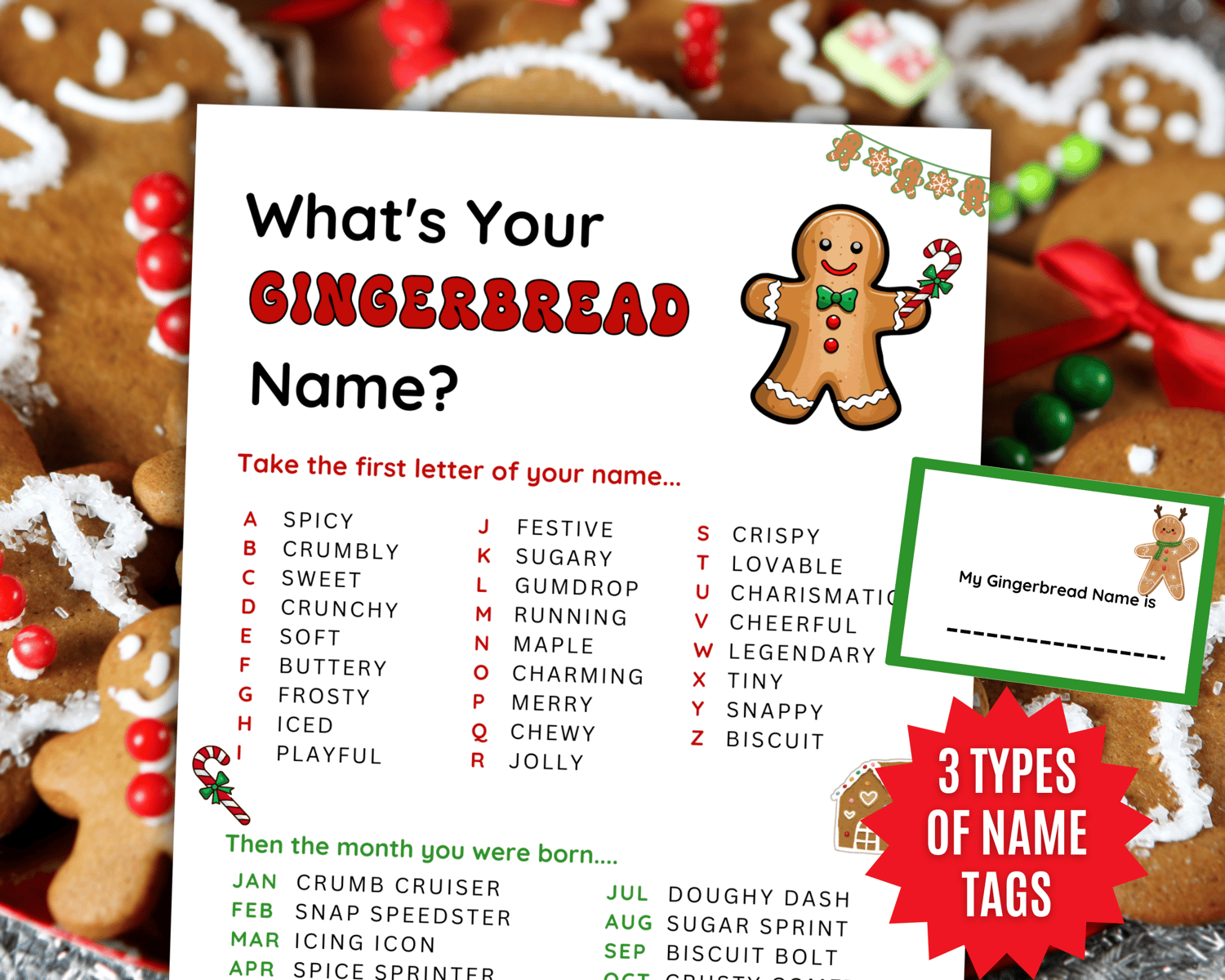 1 X PDF (5 Pages): includes 1 Gingerbread Name Generator, 3 name tag templates, and 1 x Party Sign.