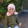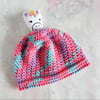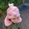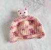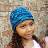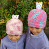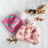 The samples are made in DMC Lil Toppers yarn that has cute pompoms included. There is enough yarn in the ball to make Toddler or Kid size.