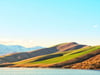 Sloping hills and snow mountains by Lake Opuha in the Mackenzie Country in New Zealand.