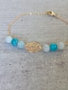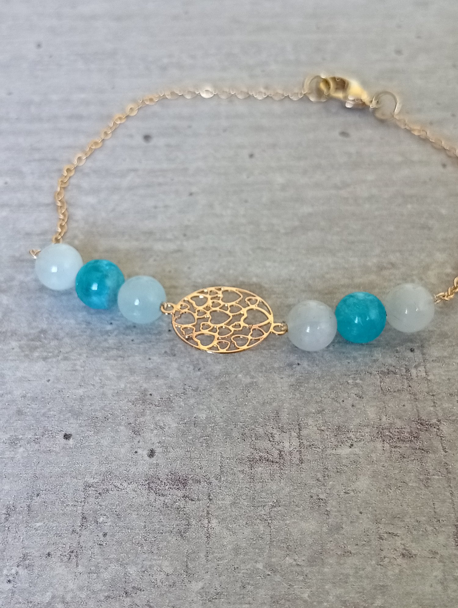 Bracelet court et raffiné, monté sur chaîne dorée, mêlant apatite et aigue-marine, avec une petite breloque finale. Une création lumineuse pour celles qui cherchent l’équilibre entre expression, intuition et douceur intérieure.