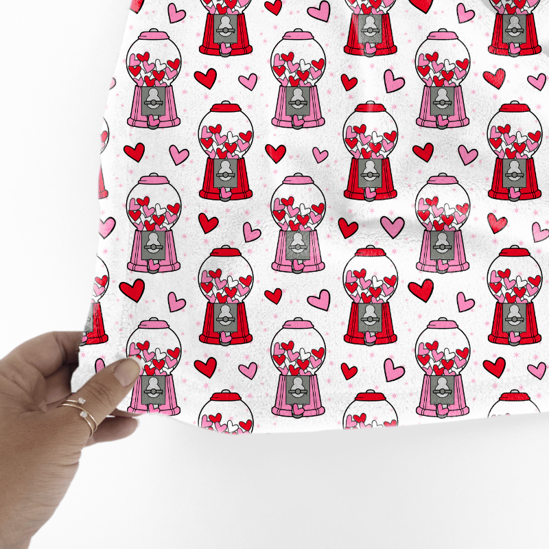 Bubblegum in red and pink heart shapes with retro bubblegum dispensers.