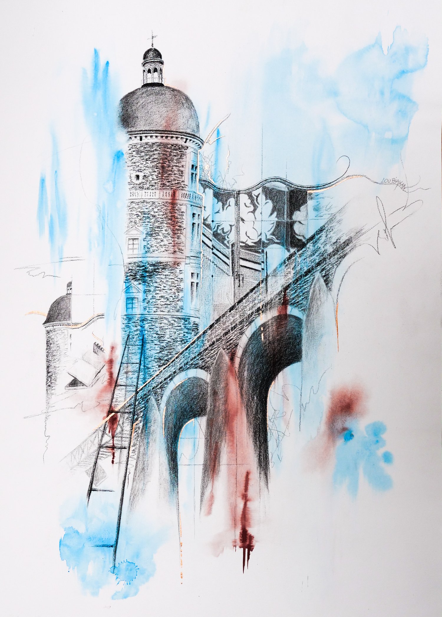 Ce qui reste en mémoire, après tant d’années. Du bleu céruléen et un brun chaud, acajou. Une salle de bain somptueuse et ses miroirs anciens. Une bibliothèque dont le bois travaillé a vu tant d’âmes curieuses passer. Une échelle qui coulisse. Un pont qui enjambe des douves. Une coupole, puis une autre. J’y suis retournée, à Serrant, après avoir fait ce tableau. Rien n’était plus comme dans mon souvenir.