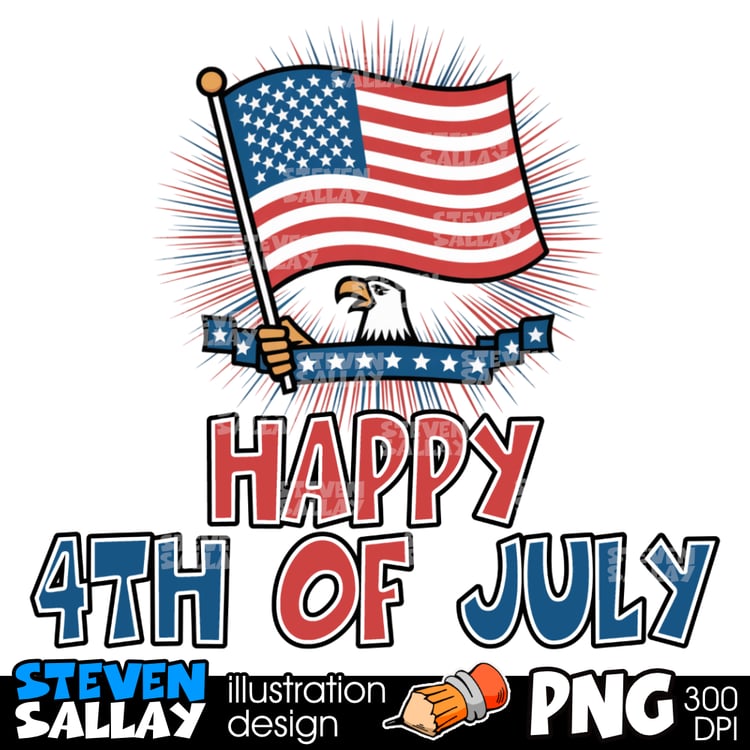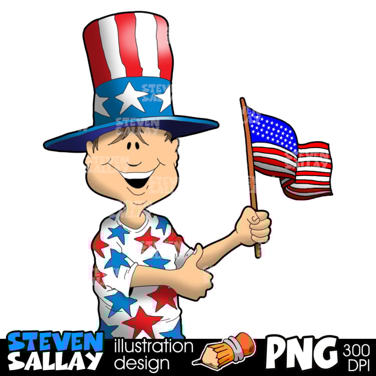 Celebrate Independence Day with this 4th of July cartoon clipart, perfect for patriotic designs, party invitations, t-shirts, stickers, posters, and digital projects. This festive Independence Day illustration features a fun, bold cartoon style ideal for summer crafts, sublimation, print-on-demand, and DIY projects. Great for designers, small businesses, and creators looking for eye-catching patriotic clipart.