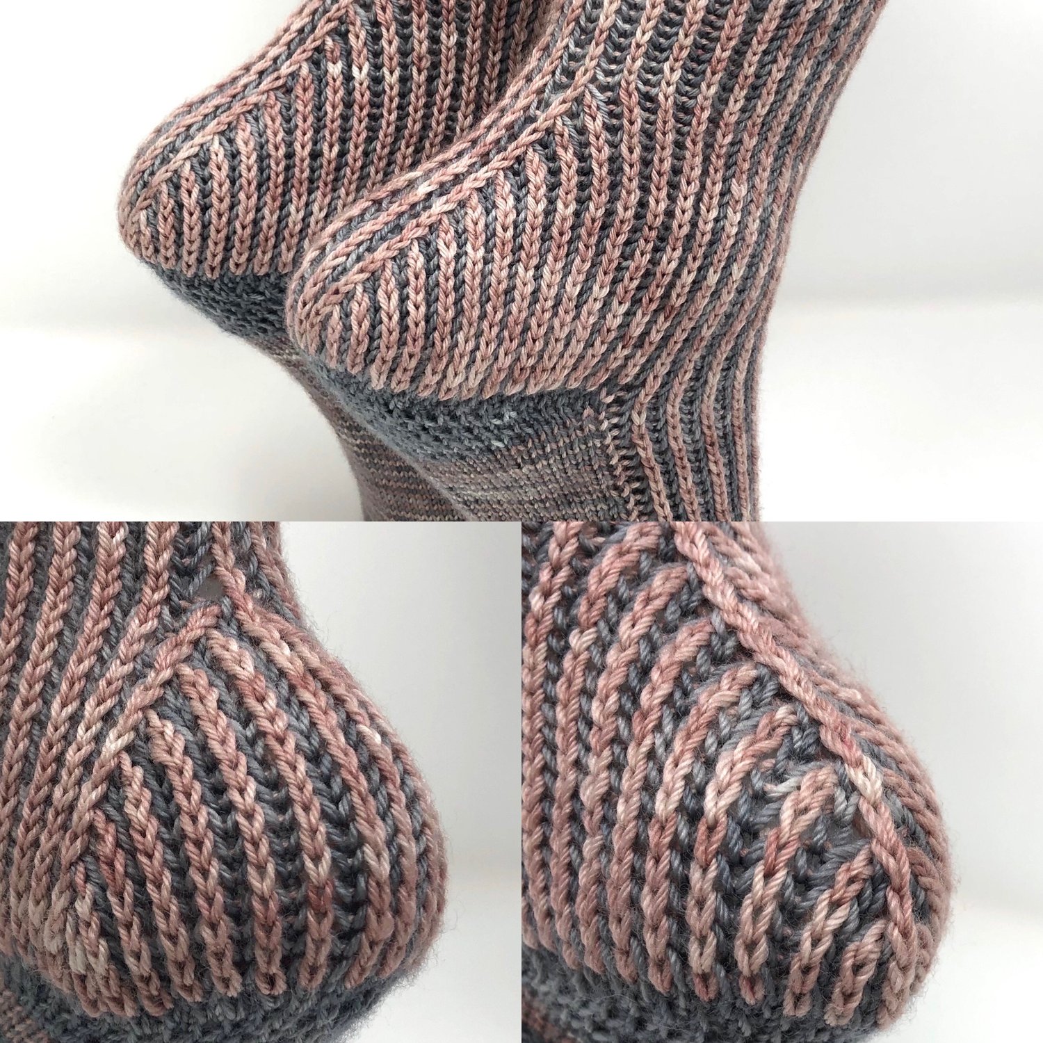 The socks are knit from the toe-up and in-the-round. The pattern uses a reverse Strong heel variation. The Strong heel is an attractive heel that gives plenty of room over the instep and is also really fun to work. There is no need to pick up stitches for this heel. The appendix includes additional heel decrease variations. I just couldn’t resist playing with possibilities for this heel!