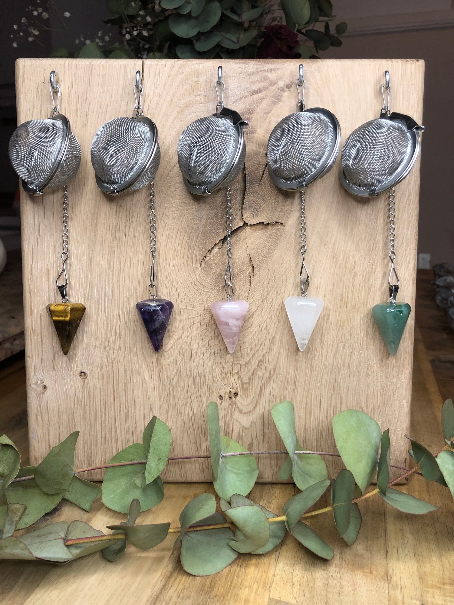 Stunning natural crystal pendant tea infusers. Perfect for creating the right atmosphere to enjoy your cup of tea and set your intentions for the day ahead.
