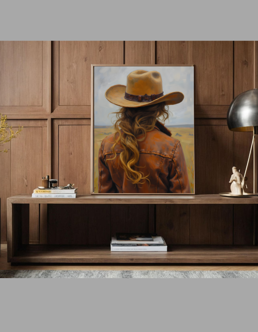 Elevate your home with this stunning Vintage Cowgirl Wall Art Printable PNG 300 DPI Digital Download. This high-resolution digital file captures a captivating scene of a cowgirl from behind, donning a classic cowboy hat and leather jacket, gazing out over a vast western landscape in an oil-painting style. Perfect for adding a touch of rustic charm and country decor to any space, whether it's your bedroom, living room, or office.