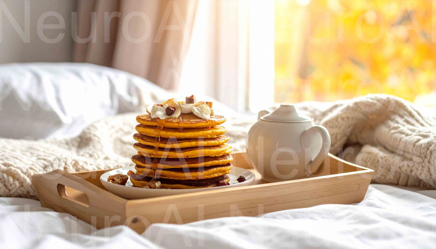 Cozy morning breakfast in bed with warm pancakes and tea