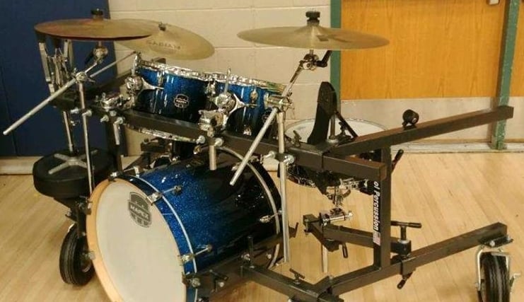 Mount everything the on rack such as snare, bass drum, cymbals booms, toms, floor tom and hi hat, microphones and other auxiliary percussion instruments.