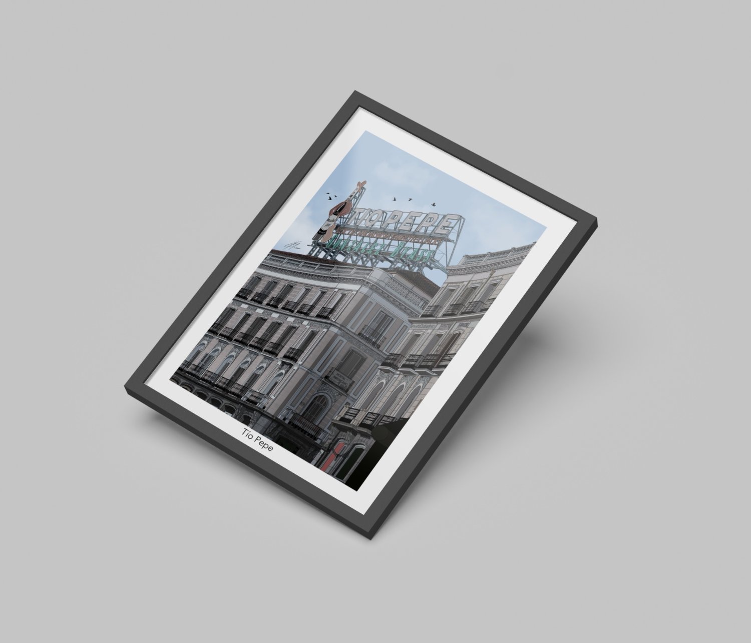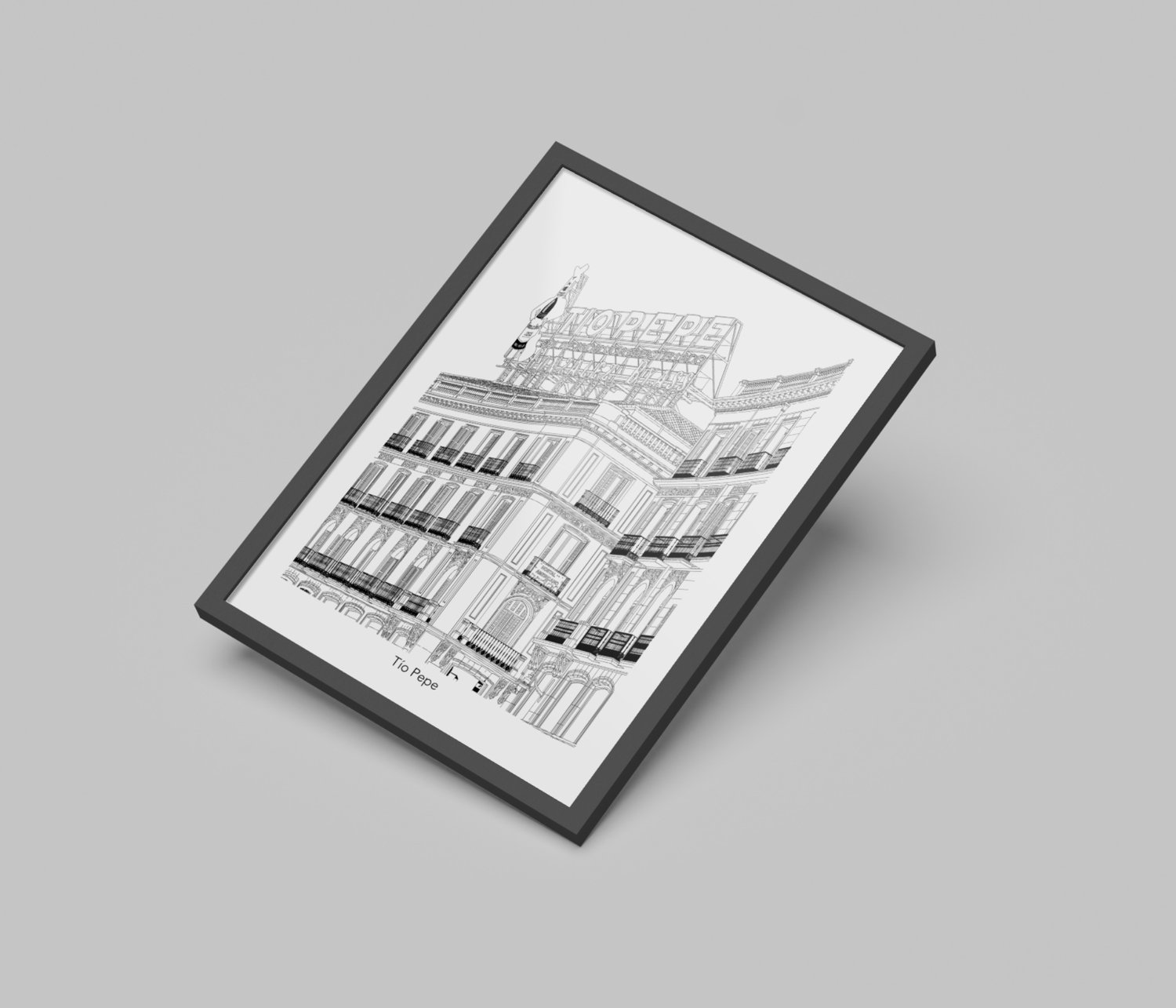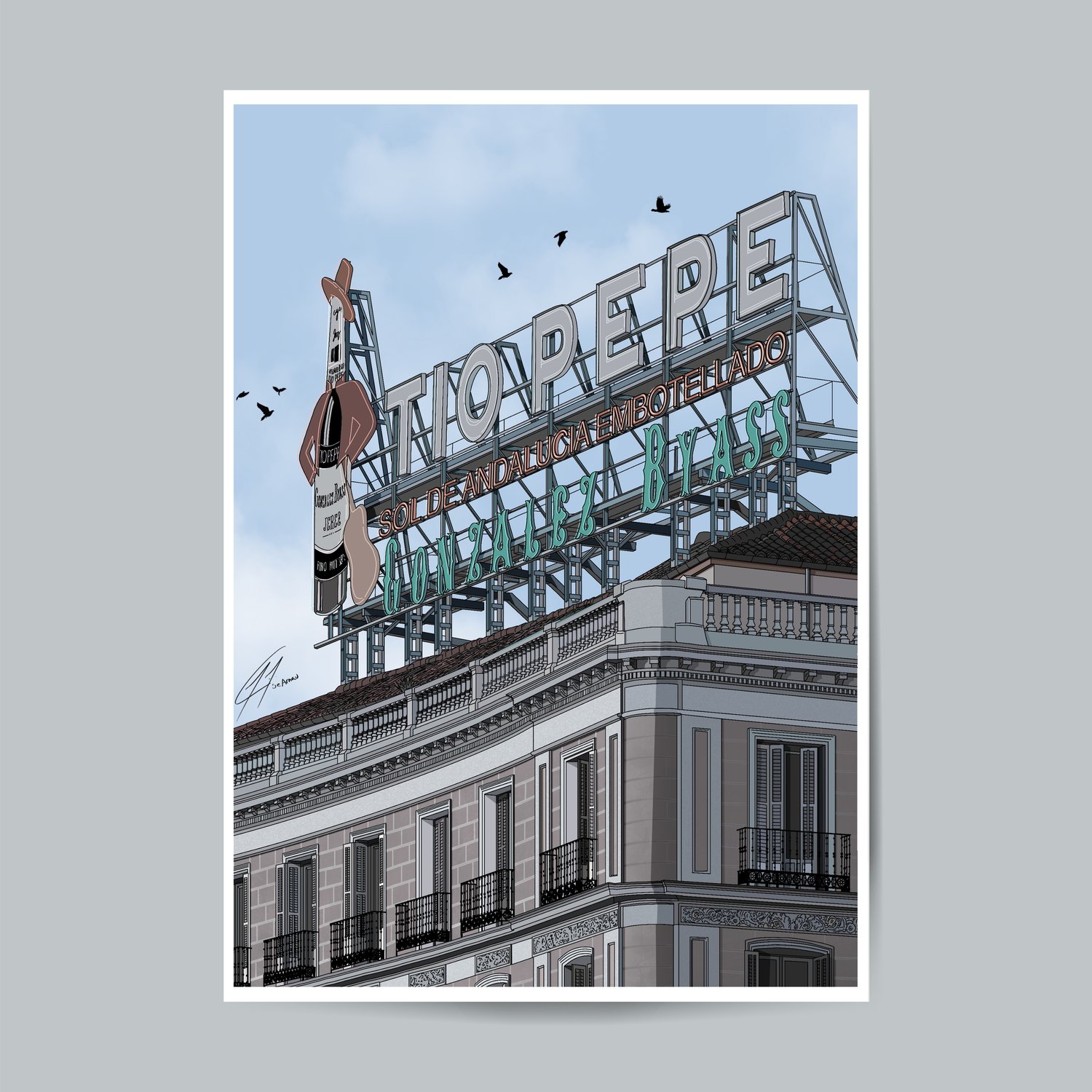Edificio de Tío Pepe en Puerta del Sol, ilustrado con estilo minimalista. Destaca su esquina curva, balcones de hierro forjado y el icónico cartel superior, sin elementos distractores, lo puedes encontrar en 3 diferentes estilos.