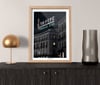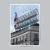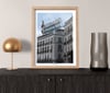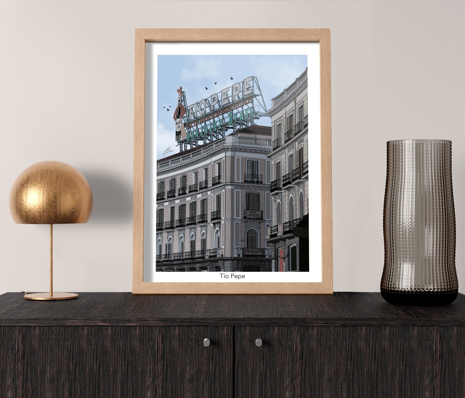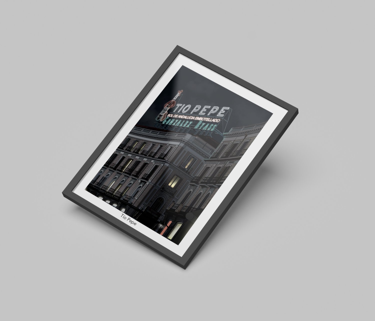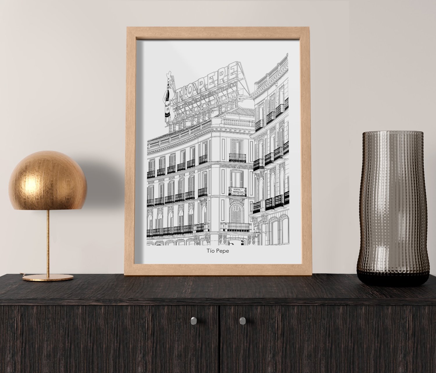 Edificio de Tío Pepe en Puerta del Sol, ilustrado con estilo minimalista. Destaca su esquina curva, balcones de hierro forjado y el icónico cartel superior, sin elementos distractores, lo puedes encontrar en 3 diferentes estilos.