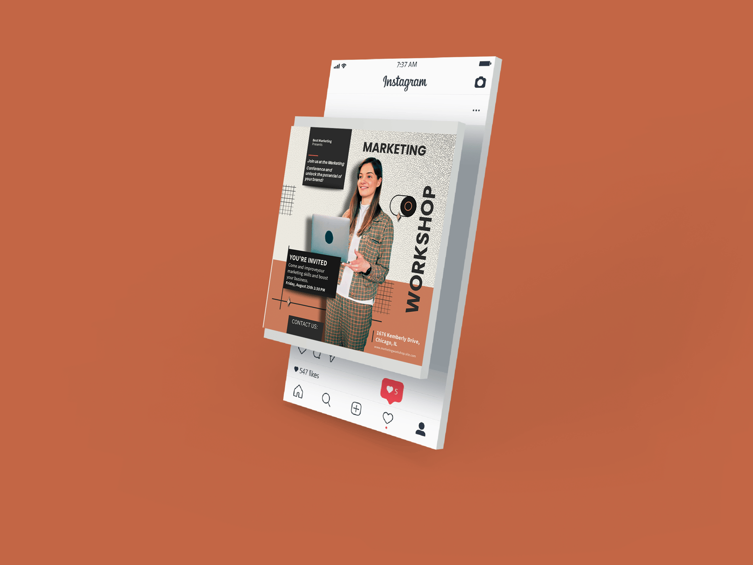 Promote your training sessions, webinars, or marketing events with this Marketing Workshop Instagram Post Template. Designed for coaches, consultants, and digital marketing professionals, this editable template allows you to showcase workshop details, dates, speakers, and key topics in a modern, eye-catching layout.