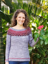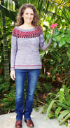 Once Again is a top-down, pullover sweater; knit in-the-round with a stranded yoke that is coupled with simple cable stitches. Short rows are used to shape the neckline after the yoke pattern is completed. Gentle waist shaping gives way to a slight A-line look at the hips resulting in an approximate 2½” to 2¾” larger hip circumference than the chest circumference.