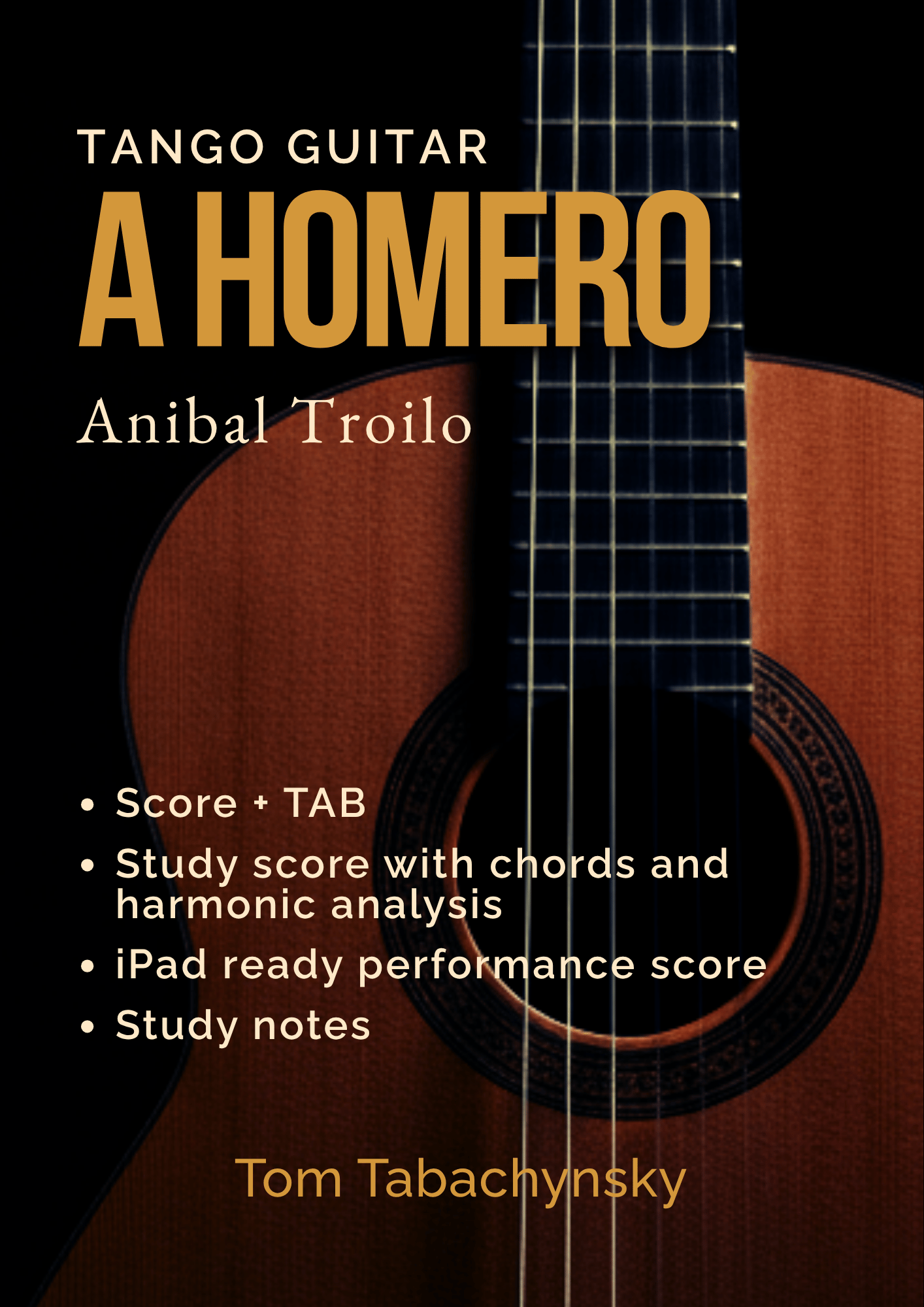 A solo guitar arrangement of Aníbal Troilo's tango A Homero, arranged by Tom Tabachynsky. This PDF includes standard notation, tablature, chord symbols, and Roman numeral harmonic analysis — making it both a performance score and a study tool for understanding tango harmony.