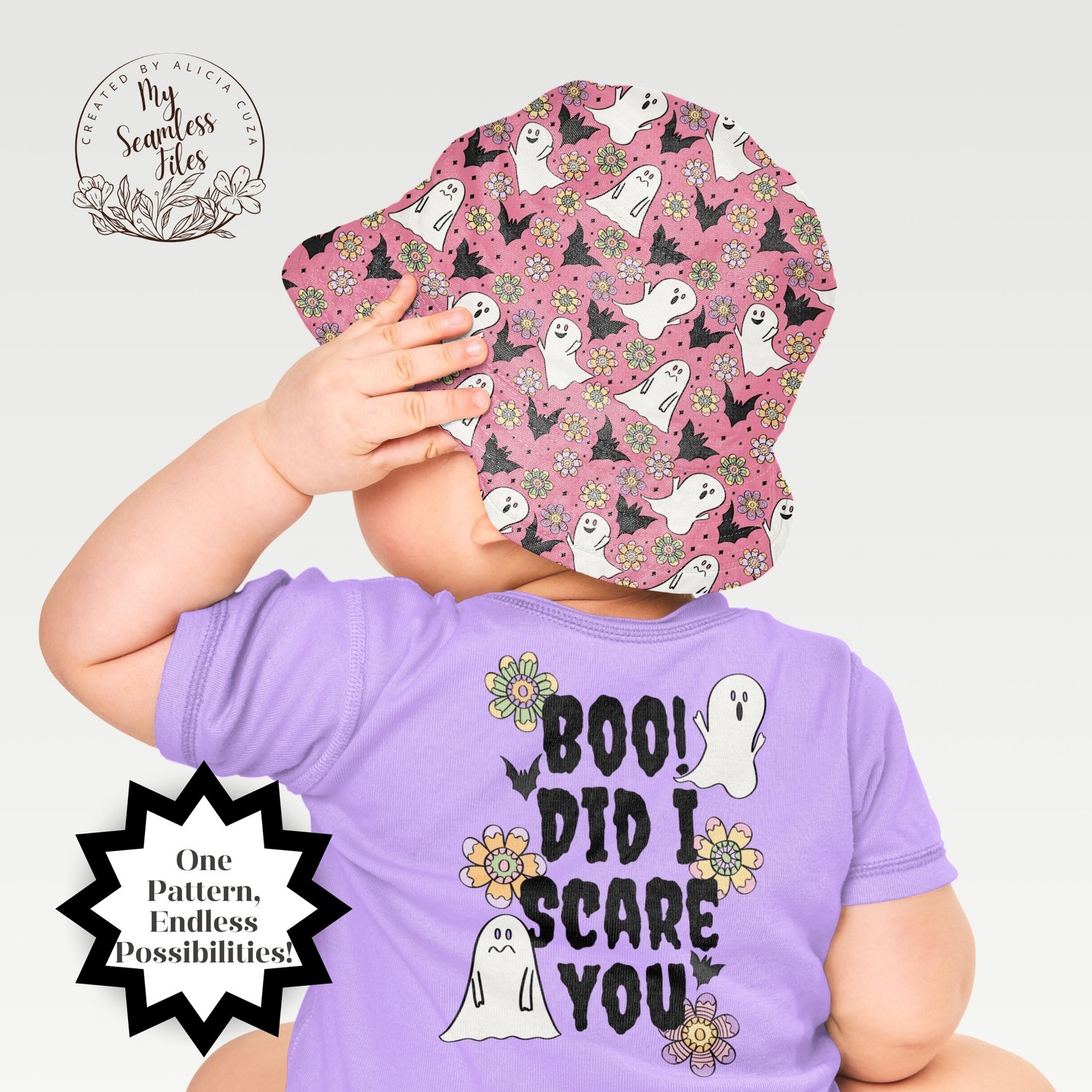 🎃 Create magical Halloween projects with this charming seamless ditsy pattern featuring friendly ghosts, bats, and beautiful flowers! This hand-drawn design showcases adorable white ghosts with sweet expressions, black bats, and colorful retro flowers scattered on a lovely lavender purple background with sparkly diamond accents.