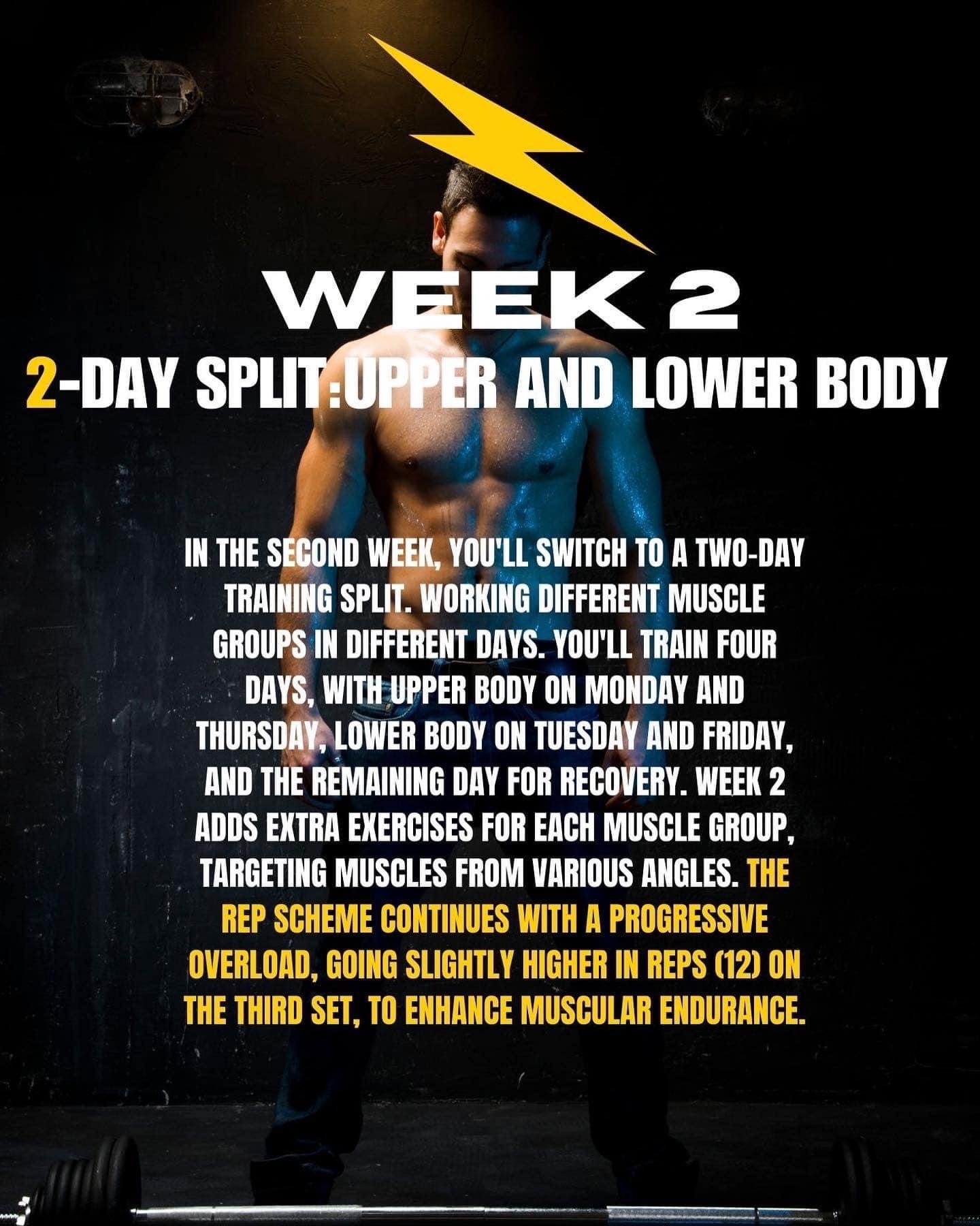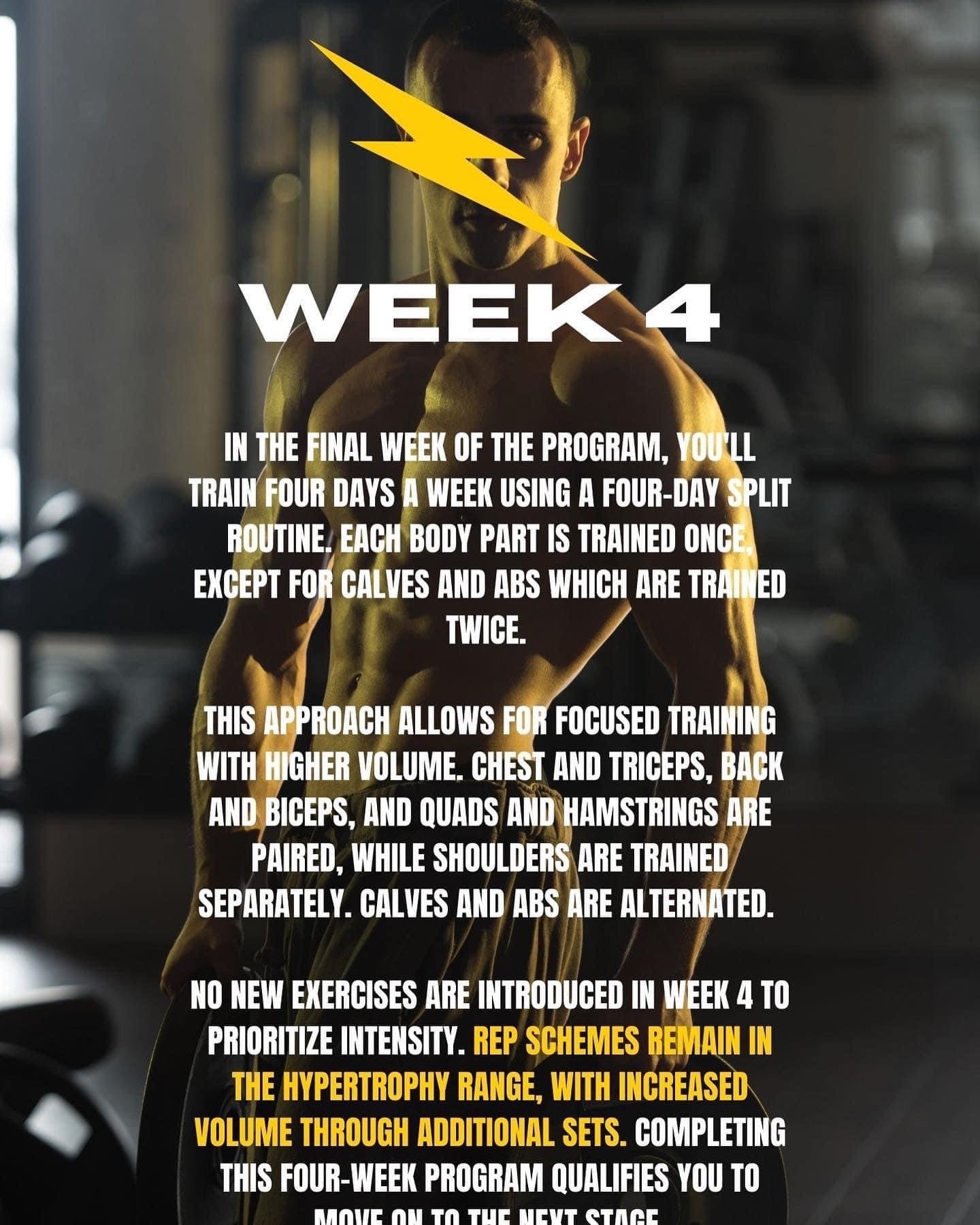 Throughout the program, each week presents new challenges, including different exercises, higher volume, increased intensity, or a combination of these factors. By consistently progressing and pushing yourself, you'll witness significant improvements in your physique and overall fitness level.
