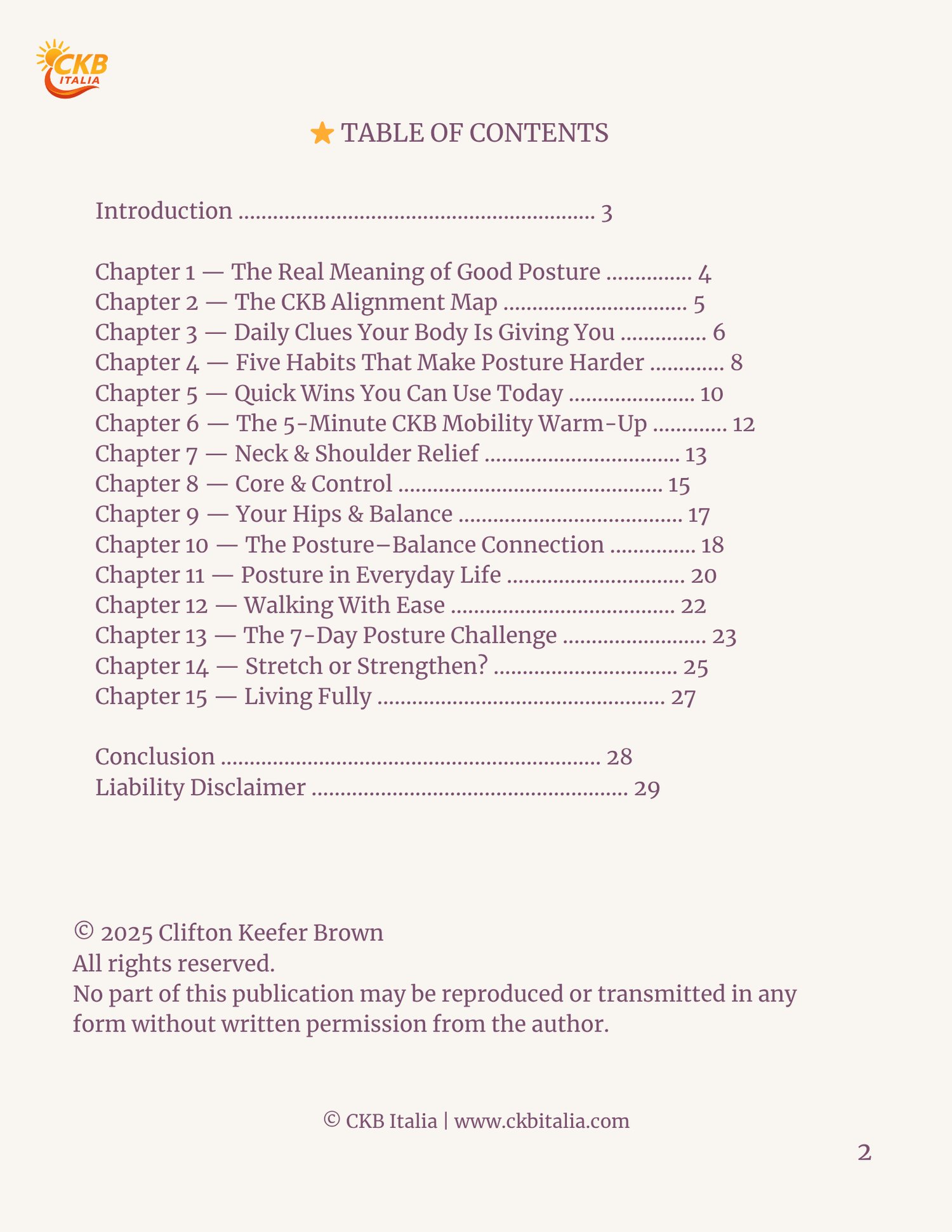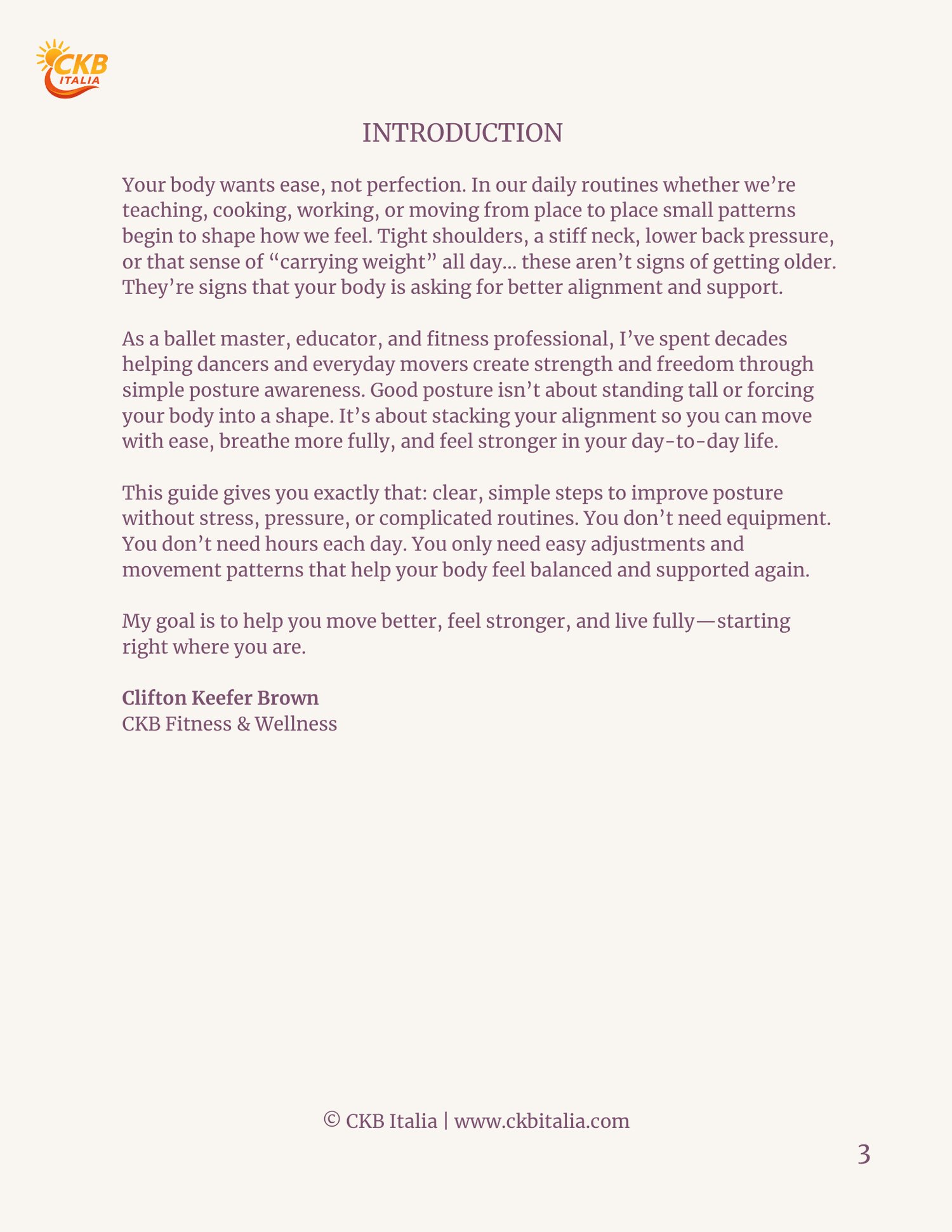 Created by Clifton Keefer Brown—educator, ballet master, and certified wellness instructor with over 20 years of movement experience—this guide blends practical alignment principles with supportive, everyday tools that help you feel better in your body.