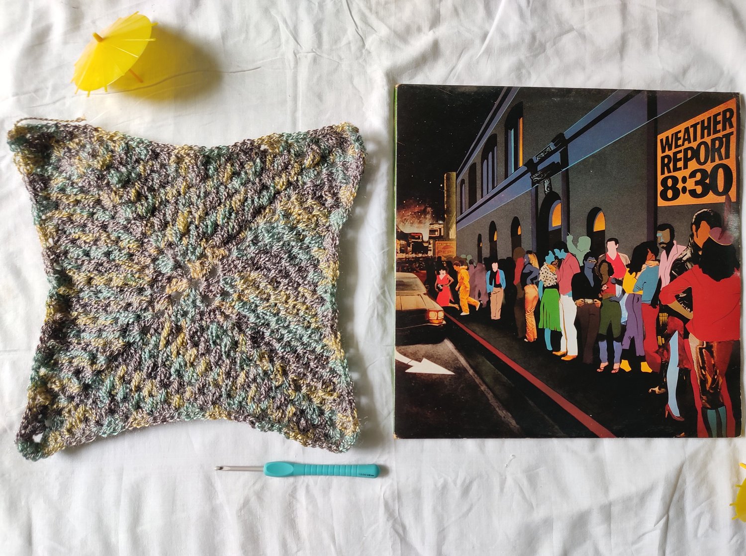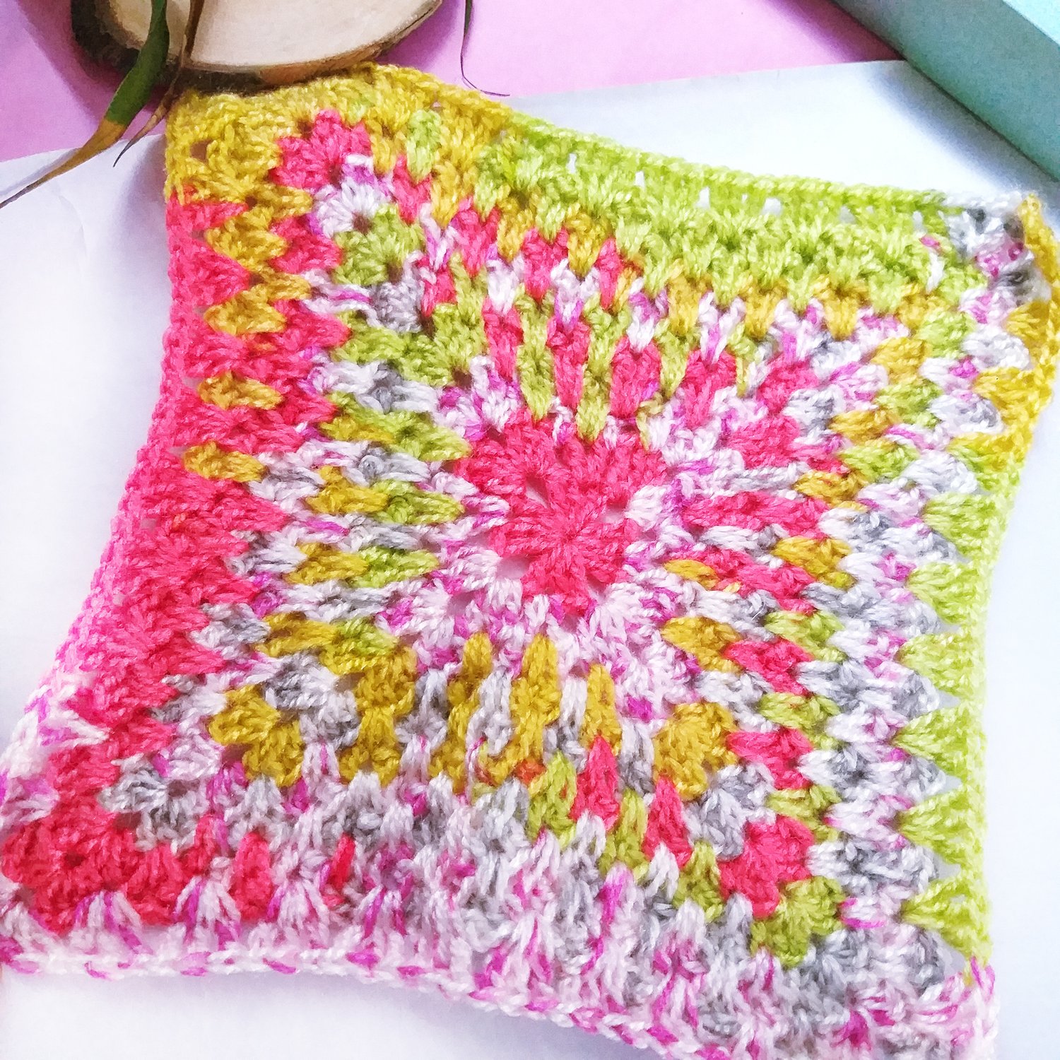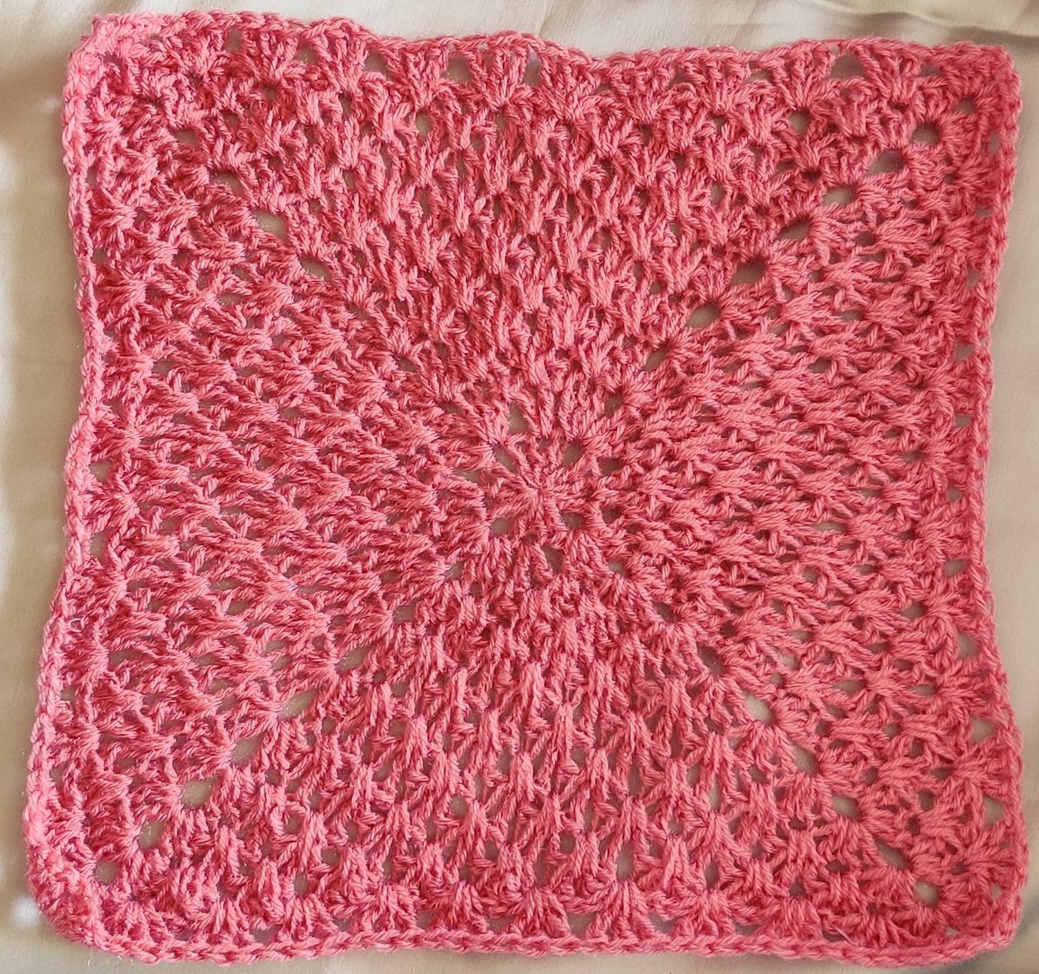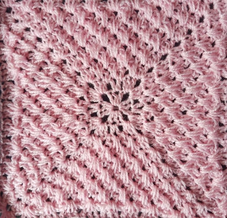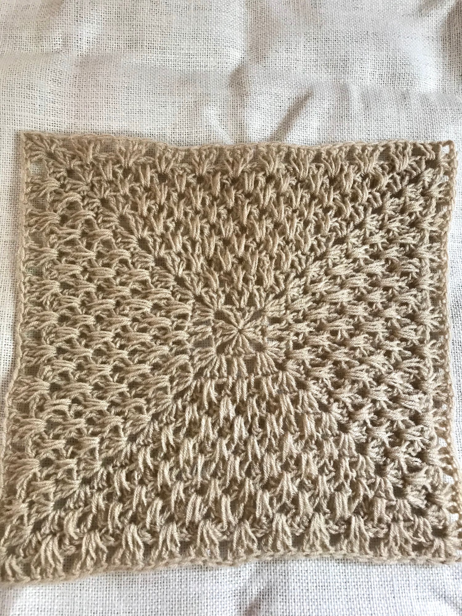 The square is based on the first thing that one notices when it is going to rain: the gentle breeze gaining some momentum! The tufts of Extended Vst create an illusion of the gently swaying treetops. The stitches are placed one round below and provide a great texture to the square. The sides tend to dip in a bit, but settle on blocking. The testers have also suggested that going up a hook size helps with the puckering.