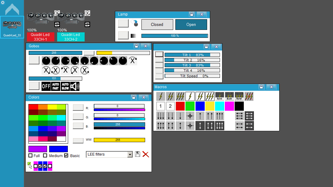 • Posiciones Tilt de las 4 cabezas juntas desde el Panel de Macros, o de forma manual e individual desde el Panel Sliders, con velocidad.