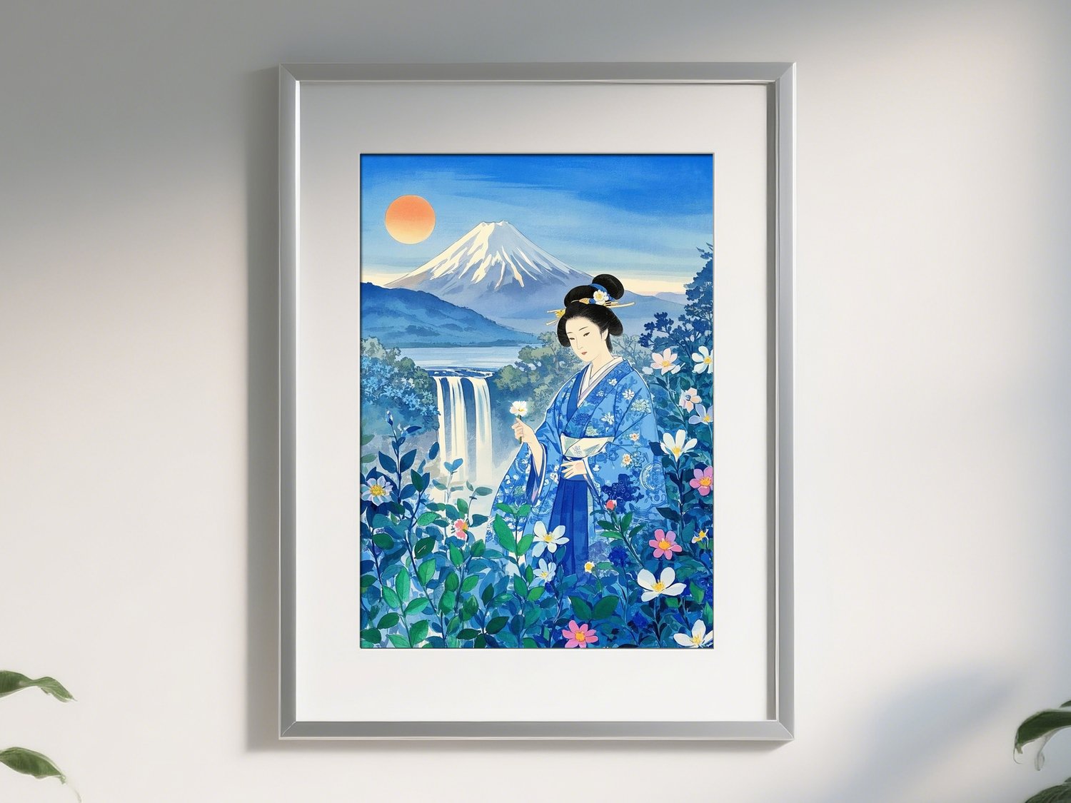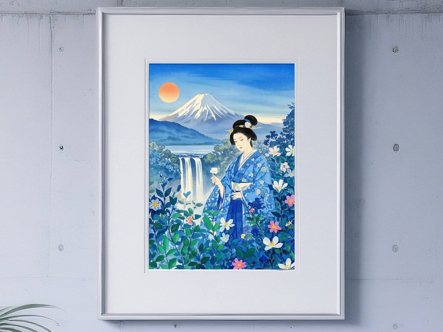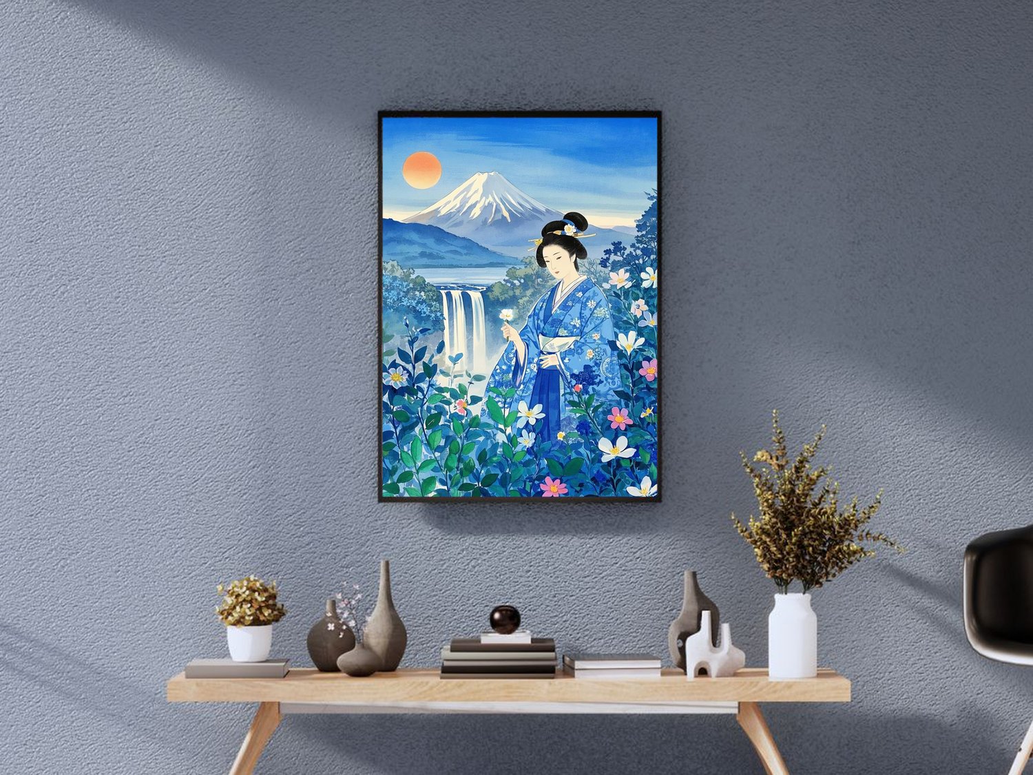 This beautiful illustration featuring Mount Fuji, a waterfall, a kimono-clad woman, and vibrant flowers is rich in Feng Shui symbolism. Each element carries positive energy that can enhance various areas of life.