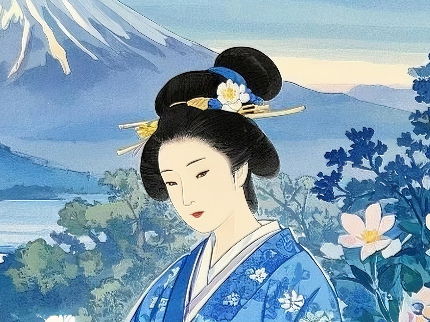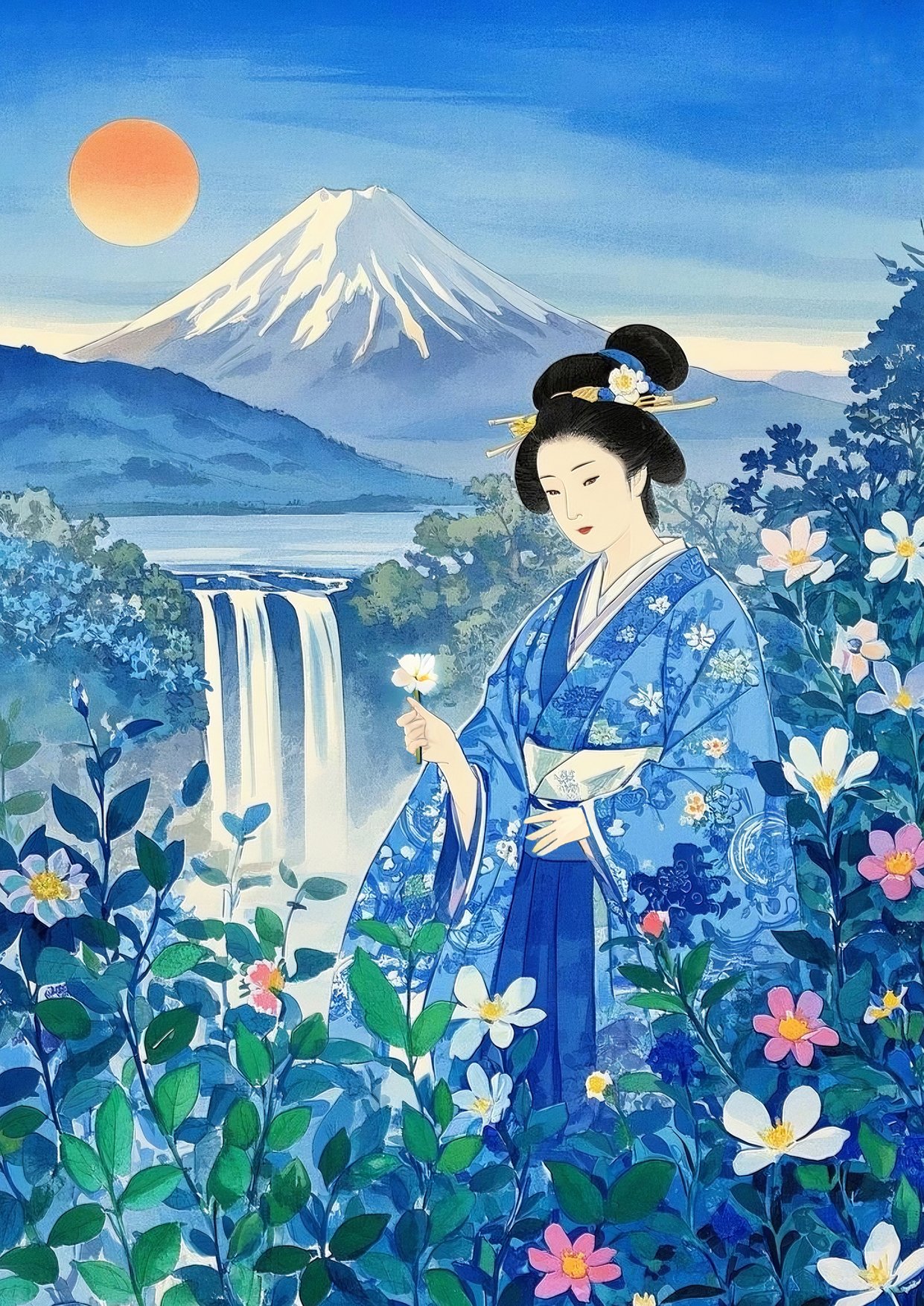 This fantastical ukiyo-e-style art depicts Mount Fuji, a symbol of Japan, a flowing waterfall (symbolizing good fortune and vitality), blooming flowers (the energy of abundance and beauty), and a graceful woman standing quietly, with the theme of good fortune and healing.