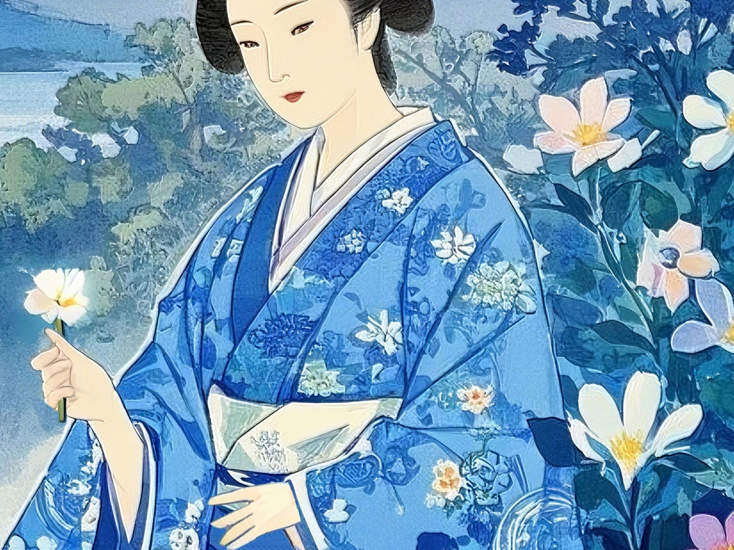 Blue kimono: Represents wisdom, calm, and spiritual cleansing.