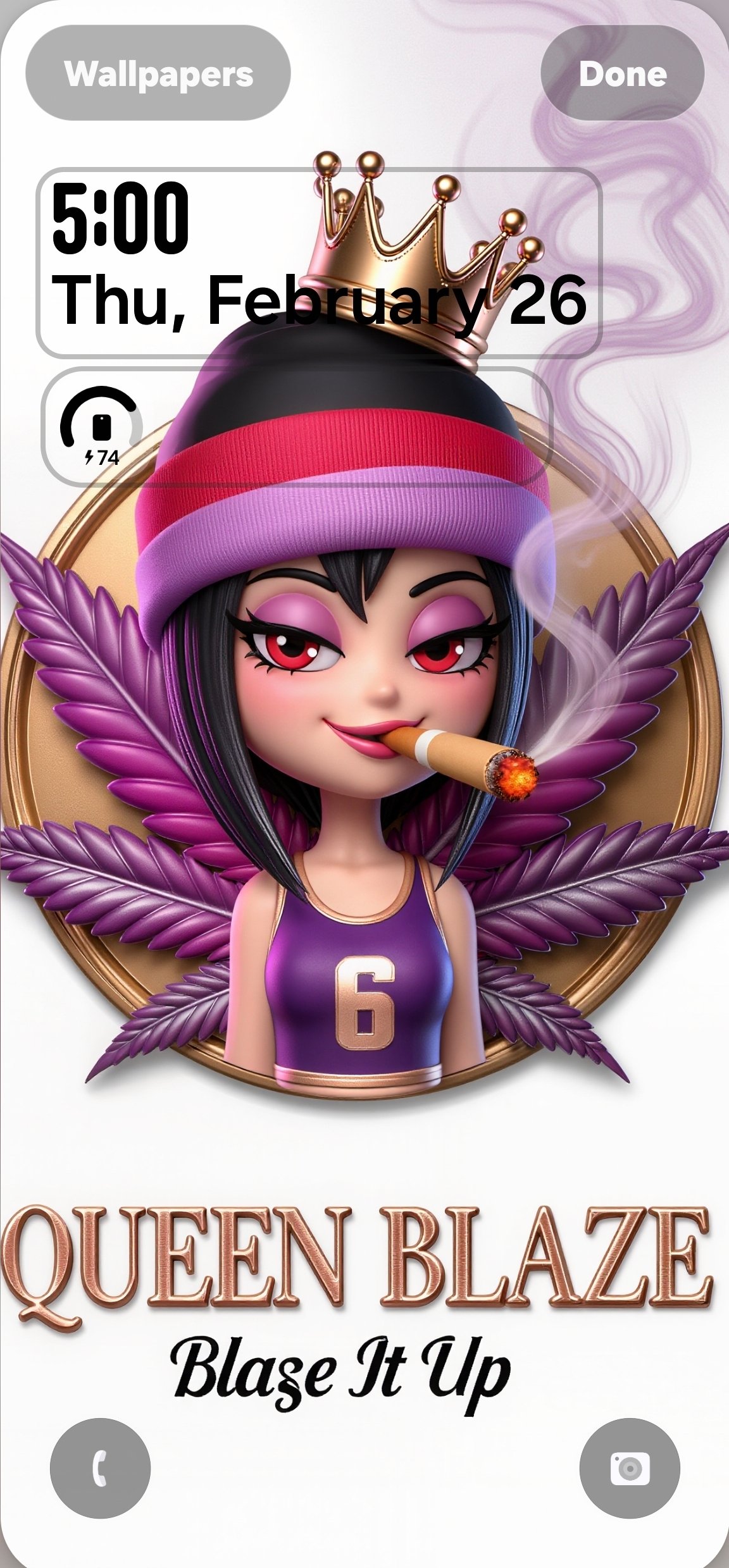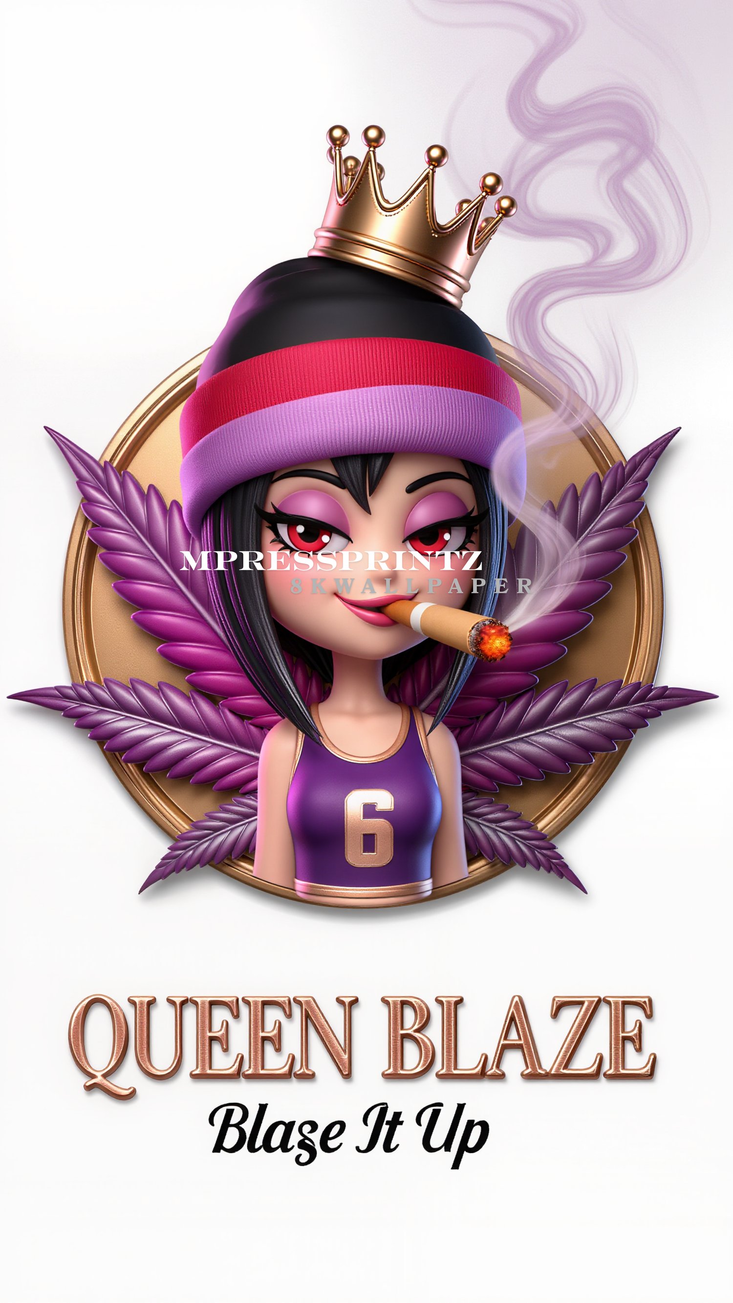 This striking design features a crowned flame queen character styled in modern streetwear, framed by rich purple leaf elements and a polished gold medallion backdrop. The smooth lighting, glossy 3D detailing, and soft smoke accents create a dramatic yet elegant look that stands out beautifully on high-resolution smartphone screens.