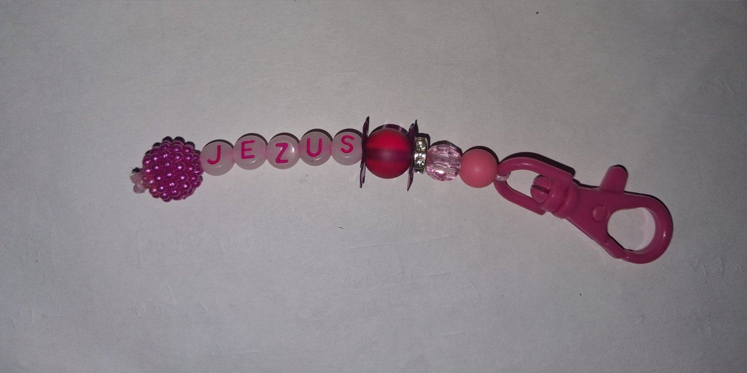 Roze sleutelhanger met tekst "Jezus"