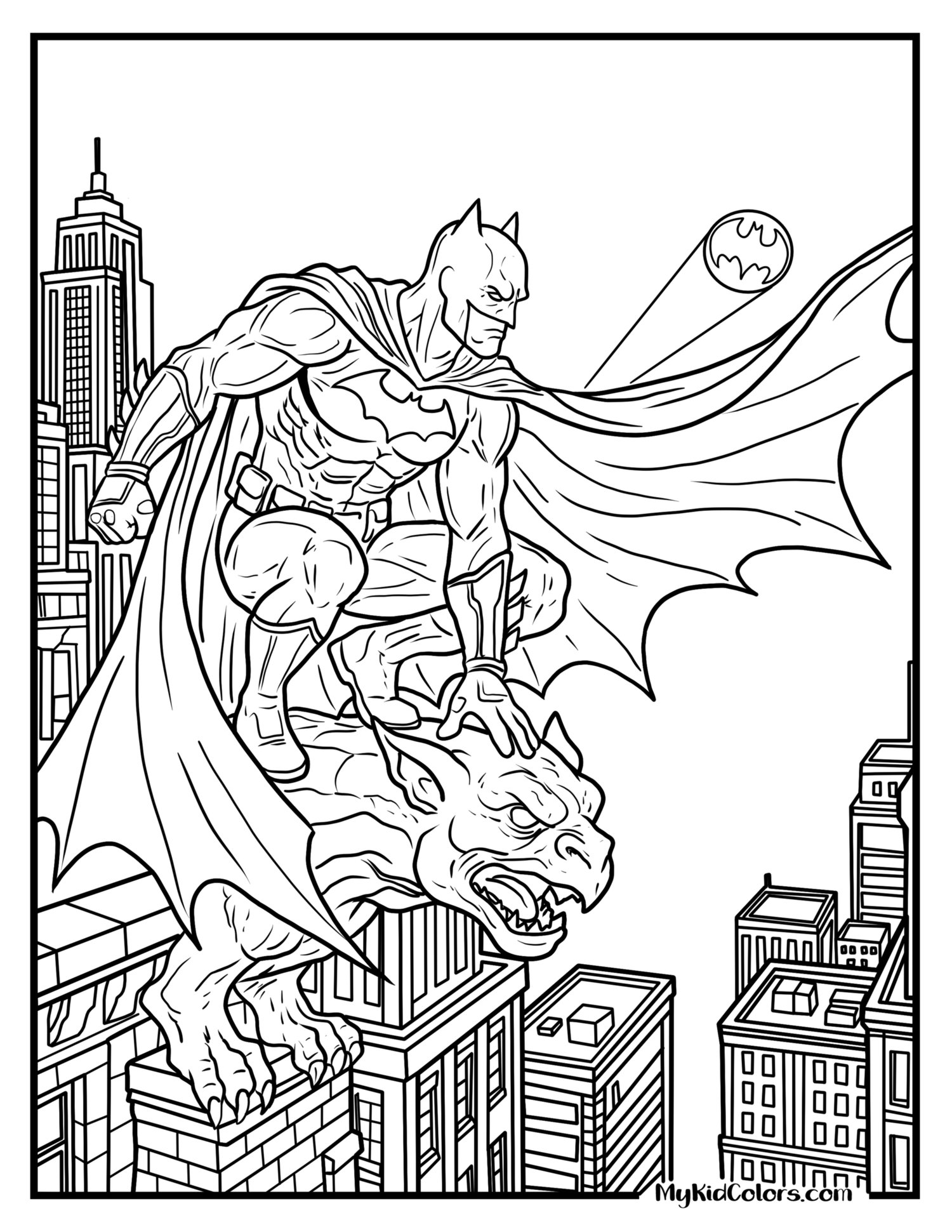 - Detailed Gotham City coloring pages, complete with the Bat-Signal lighting up the sky.