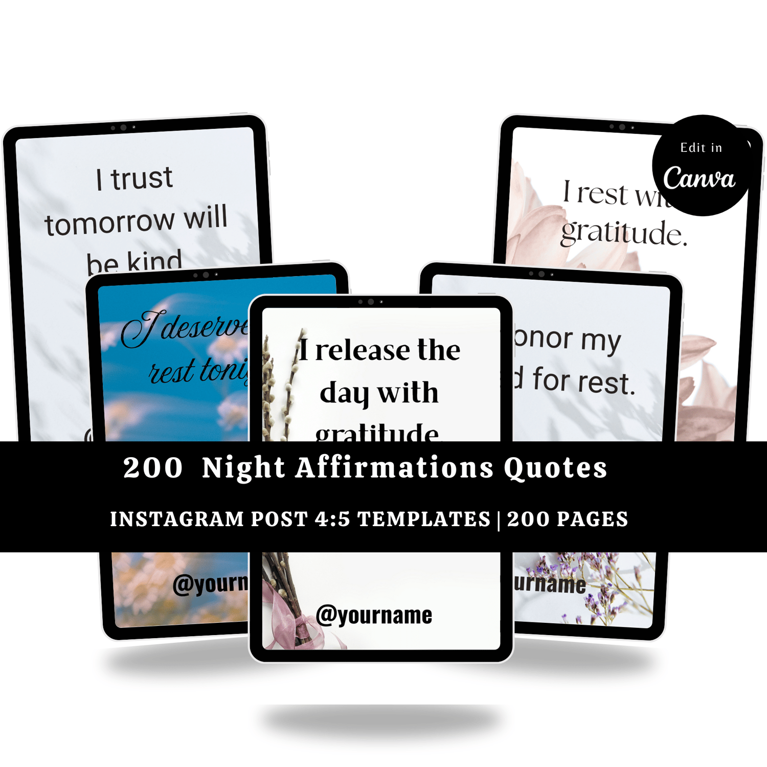 End your day with calm, gratitude, and peace using these 200 Night Affirmations Quote Templates. Designed to help you release stress, quiet your mind, and invite restful sleep, these affirmations are the perfect addition to your evening routine.