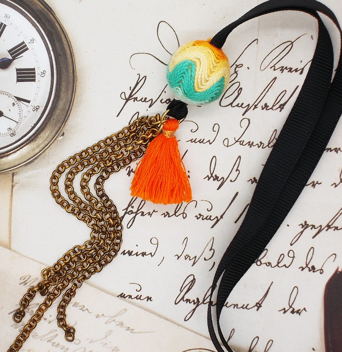Handcrafted with satin ribbon, cotton thread and steel chain