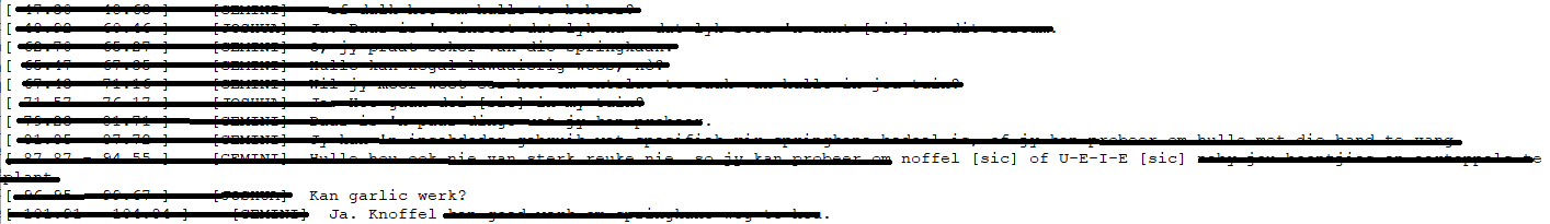 In this 5.13-minute, 65-sentence pack, a native English Afrikaans learner has a conversation with Gemini about locusts. In this audio, Gemini uses two different pronunciations for 'garlic' in Afrikaans, and spells out one of the words (incorrectly) from its contaminated Afrikaans dataset. But overall, Gemini performs better in this audio than in others, and the learner may have learned something.