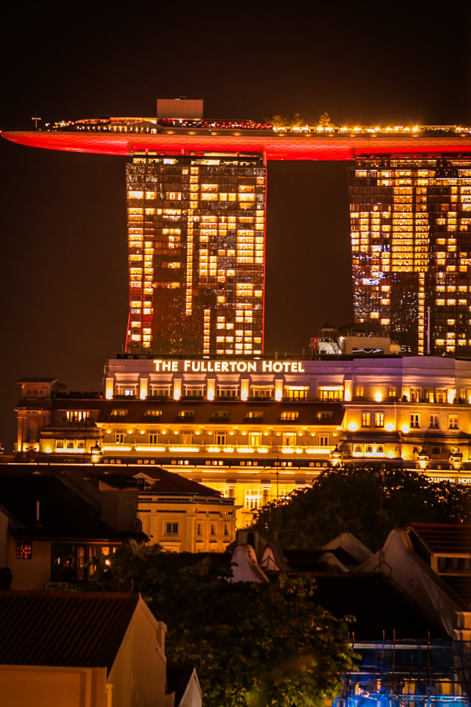 The unmistakable silhouette of Marina Bay Sands glows above the historic waterfront, bridging past and present in a single frame. Warm lights ripple across the bay as the city settles into evening.