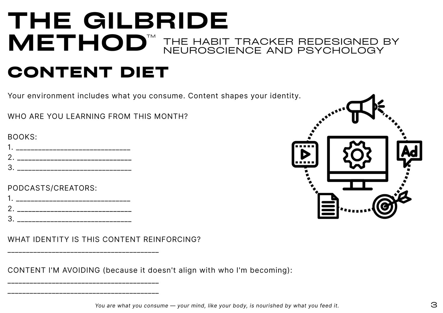 What you consume shapes who you become. You'll track what you read, watch, and listen to—and align it with your identity.