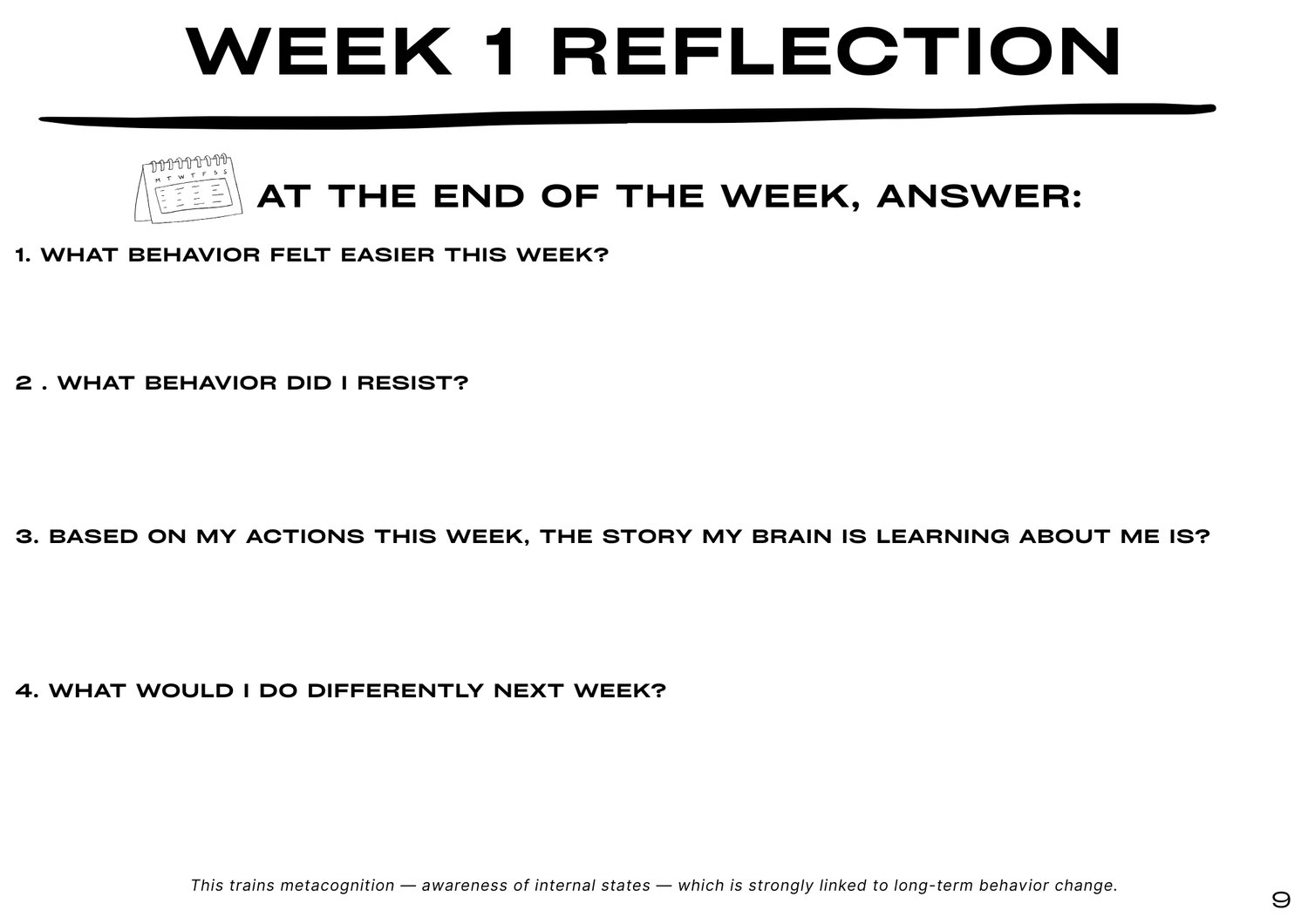 You'll answer 4 questions weekly that train your brain to notice patterns and self-correct. This is called metacognition—and it's proven to create lasting change.