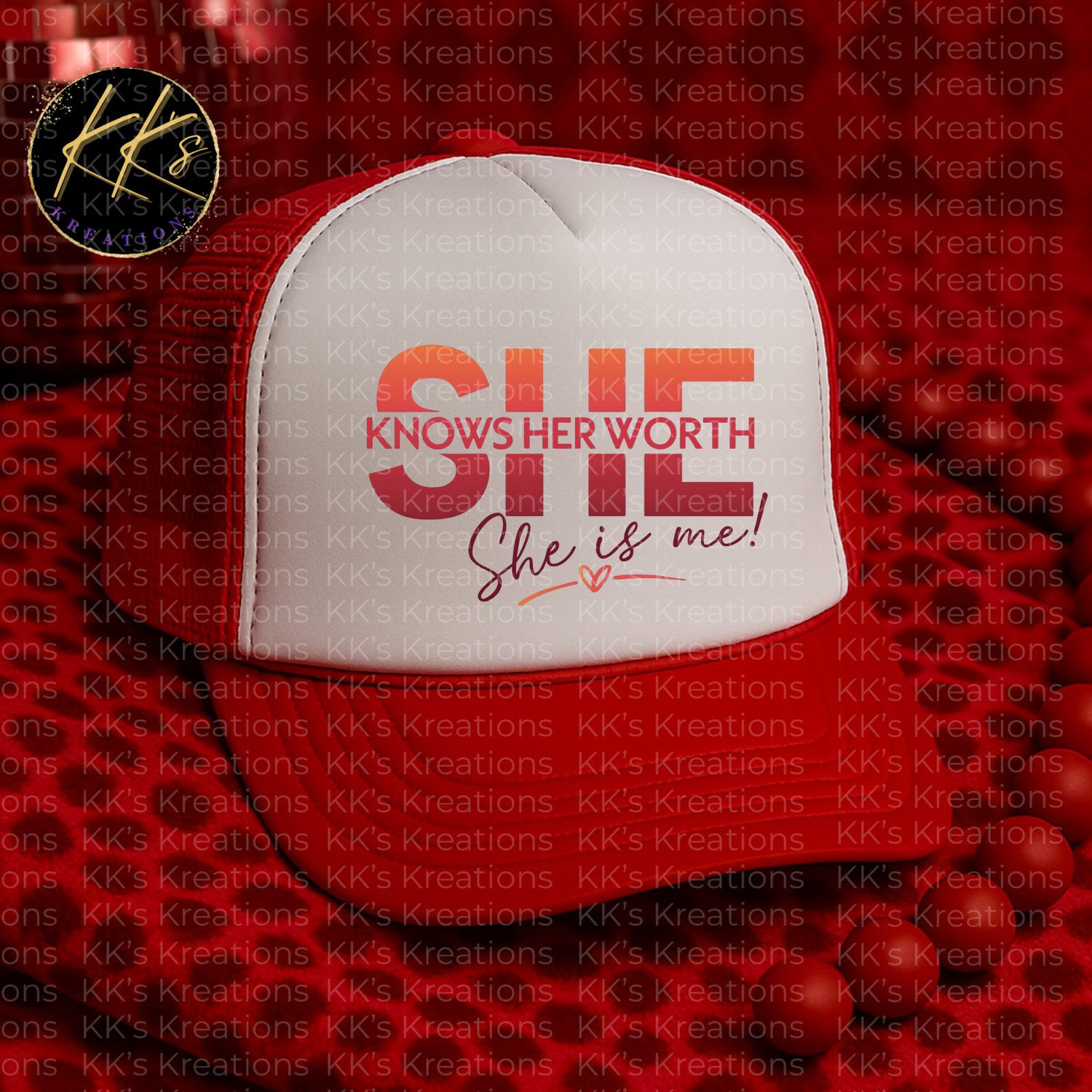 Step into your power with this bold “She Knows Her Worth – She Is Me” Trucker Hat.
