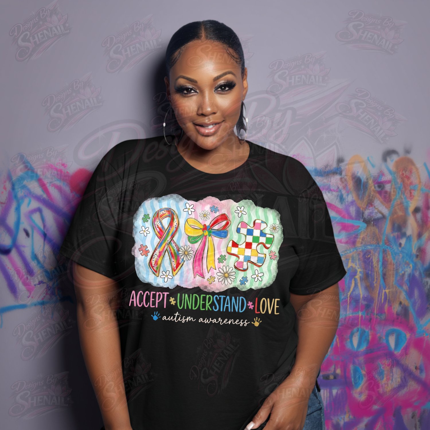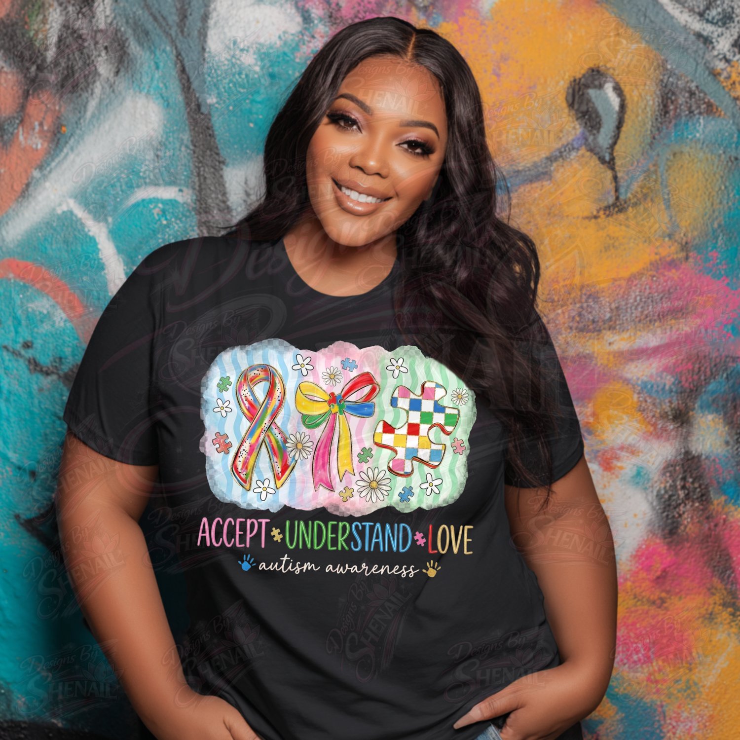 Show support, acceptance, and love with this Autism Awareness PNG design featuring the message “Accept • Understand • Love.” The artwork includes colorful autism puzzle pieces, awareness ribbon, bow, and cheerful daisies, symbolizing compassion, neurodiversity, and advocacy.